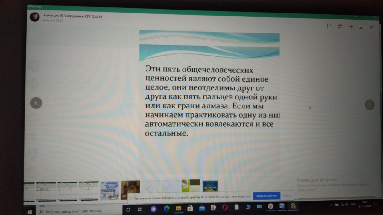 23 ноябрь 2020 0 1 2 3 4 5 "Жалпыадамзаттық құндылықтар - бақытты өмірдің негізі"/" Общечеловеческие ценности - основа счастливой жизни" 23 қарашада әр ауысымда 1-11 сыныптардан бастап" жалпыадамзаттық құндылықтар - бақытты өмірдің негізі" тақырыбында республикалық сынып сағаты өтті. 23 ноября в каждой смене прошел Республиканский классный час на тему:" Общечеловеческие ценности - основа счастливой жизни" с 1 - 11 классы. Осы беттің QR-коды:QR-код этой страницы: