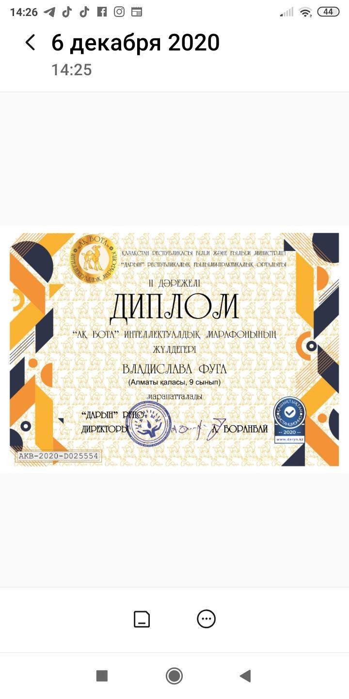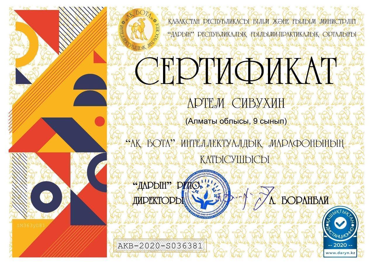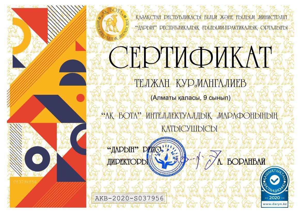 Математика бойынша "Ақбота" республикалық, зияткерлік марафонының қатысушылары: Пустовитова Вероника, 5г сынып оқушысы, I дәрежелі Диплом алды, Фуга Владислава, 9 "А" сынып оқушысы, II дәрежелі дипломмен марапатталды. Қатысқаны үшін сертификаттар: 9 "А" сынып оқушысы Сивухин Артем, 9 "А" сынып оқушысы Құрманғалиев Телжан.Участники республиканского, интеллектуального марафона по математике "Ак БОТА": Пустовитова Вероника, ученица 5Г класса, получила Диплом I степени, Фуга Владислава, ученица 9 "А" класса, награждена Дипломом II степени. СЕРТИФИКАТЫ за участие: ученик 9 "А" класса Сивухин Артем, ученик 9 "А" класса Курмангалиев Телжан.