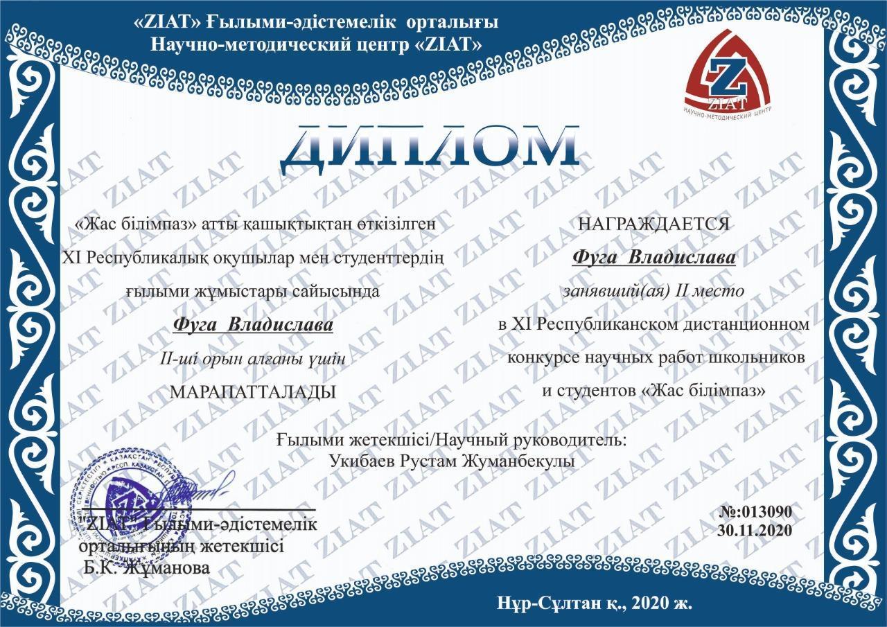 Ученица 9 "А" класса Фуга Владислава заняла 2 место в республиканском, дистанционном конкурсе научных работ школьников и студентов "Жас білімпаз". Научный руководитель,