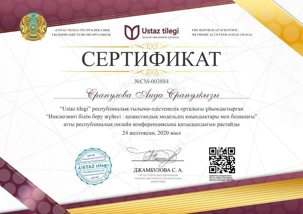 Біздің мұғалімдер үнемі өз біліктіліктерін арттырып, түрлі қашықтықтан олимпиадаларға қатысады. Мұндай мұғалім-Сарапулова Аида Срапуловна. Аида Расуловна тарих пәнінің мұғалімі, өзінің кәсіби қызметіндегі белсенді жұмысы үшін сертификатпен, дипломмен марапатталған.