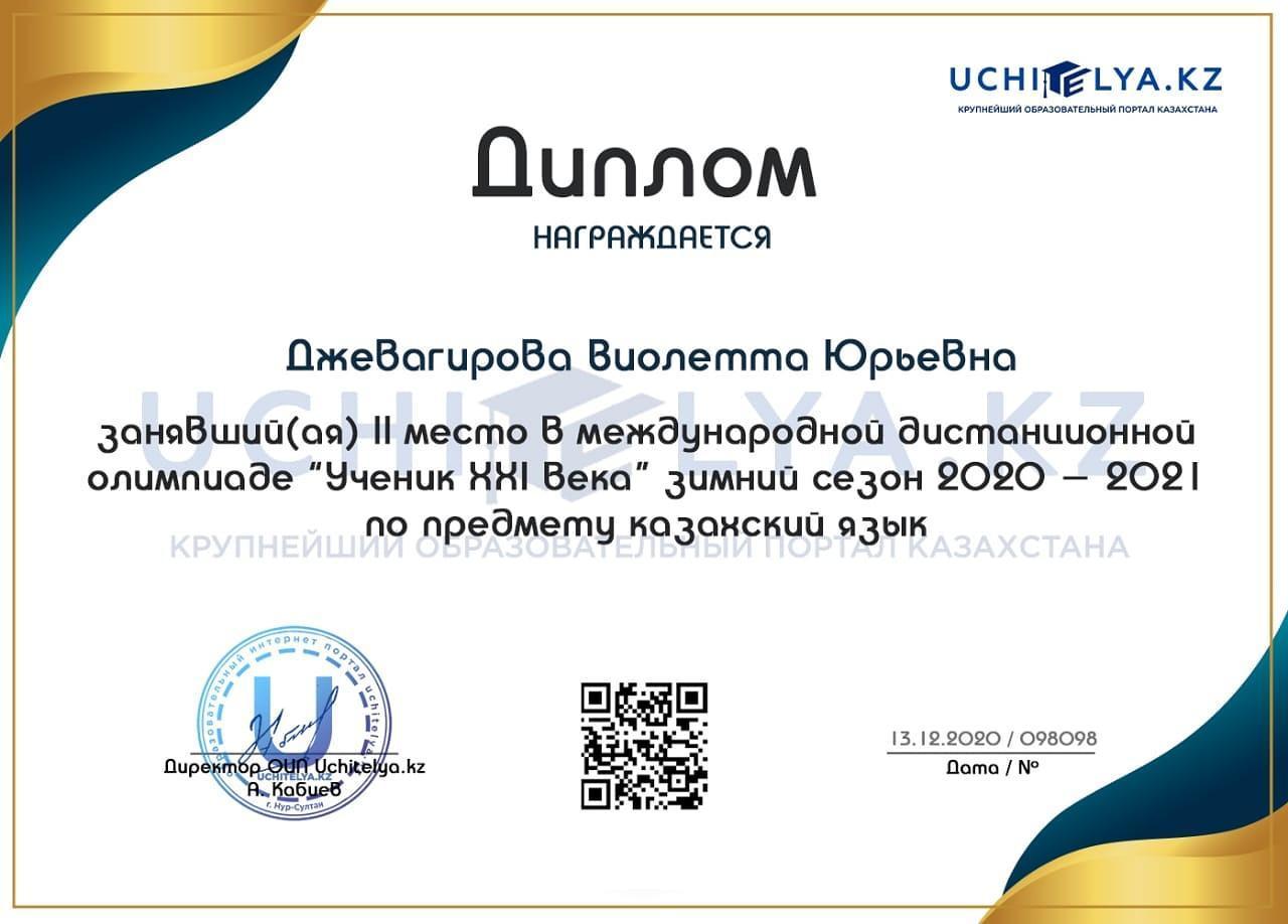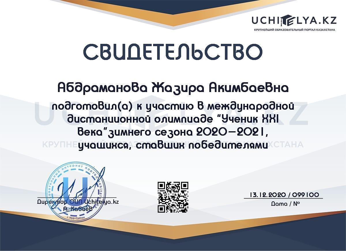 Қазақ тілі мұғалімі Абдрахманова Жазира Акимбаевна оқушыларды "ХХІ ғасырдың оқушысы"қазақ тілі пәнінен қашықтықтан, Республикалық олимпиадаға дайындады. Жазира Әкімбайқызы оқушыларды белсенді дайындағаны үшін куәлікпен марапатталды. 8В сынып оқушысы Джевагирова Виолетта қатысқаны үшін дипломдармен марапатталды.