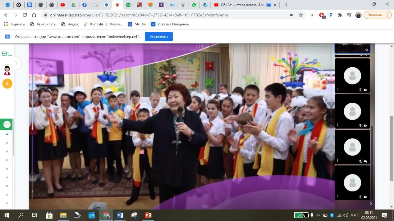 1-11 сынып жетекшілері адамгершілік-рухани білім беру бағдарламасының авторы туралы "С.Ә. Назарбаеваның Өзін-өзі тануы" тақырыбында сынып сағатын өткізді. Оқушылар еліміздің бірінші ханымы С.Ә. Назарбаеваның қызметі туралы білді. Бөбек қорынан фильм көрсетілді