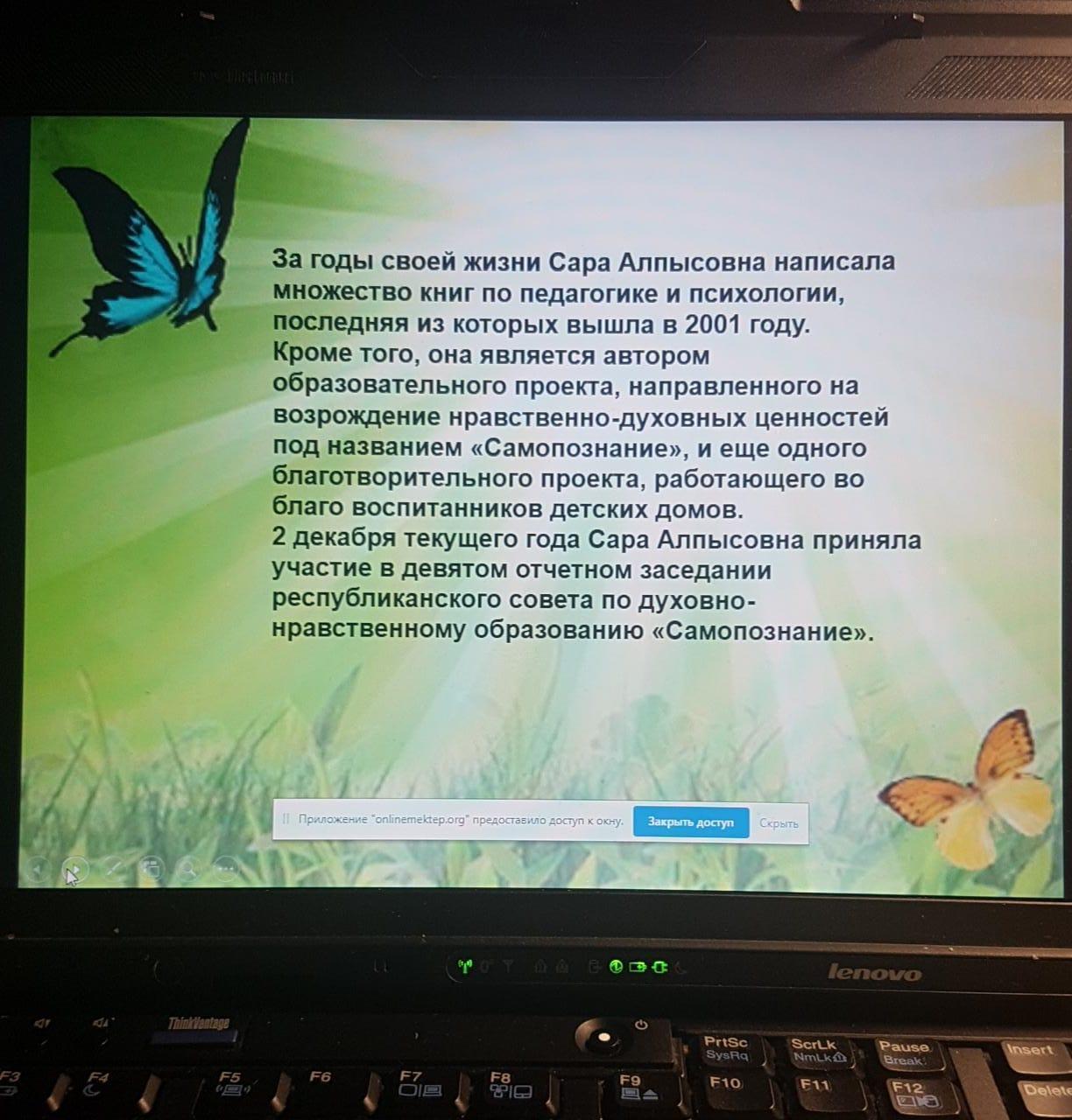 Классные руководители 1-11 классов провели классный час на тему "Самопознание С.А. Назарбаевой" об авторе программы нравственно-духовного образования. Учащиеся узнали о деятельности Первой леди страны С.А.Назарбаевой. Был показ фильма из фонда Бобек