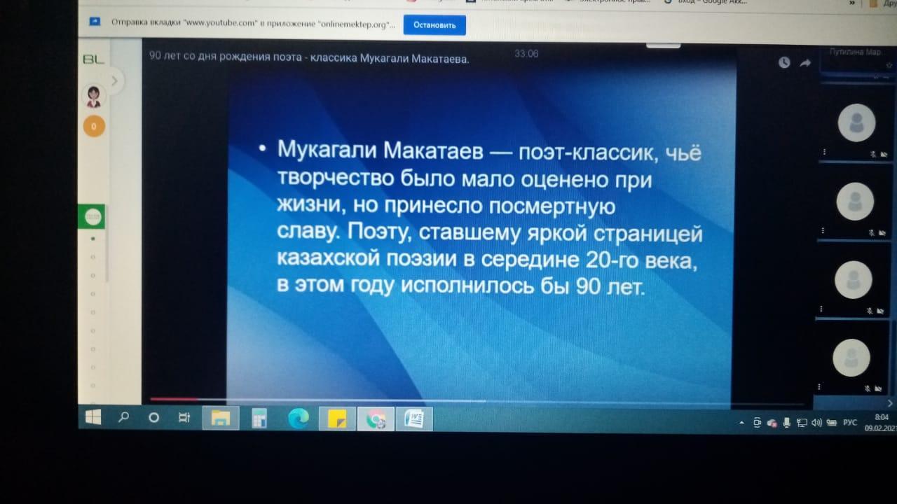 Классные руководители провели классный час посвященный 90-летию Мукагали́ Сулейменовича Маката́ева. Из биографии Мукагали С.М., родился 9 февраля, 1931 года, село Карасаз, Нарынкольский район, Алма-Атинская область, — 27 марта, 1976 года, Алма-Ата, Казахская ССР, СССР) — казахский советский поэт и писатель, переводчик.