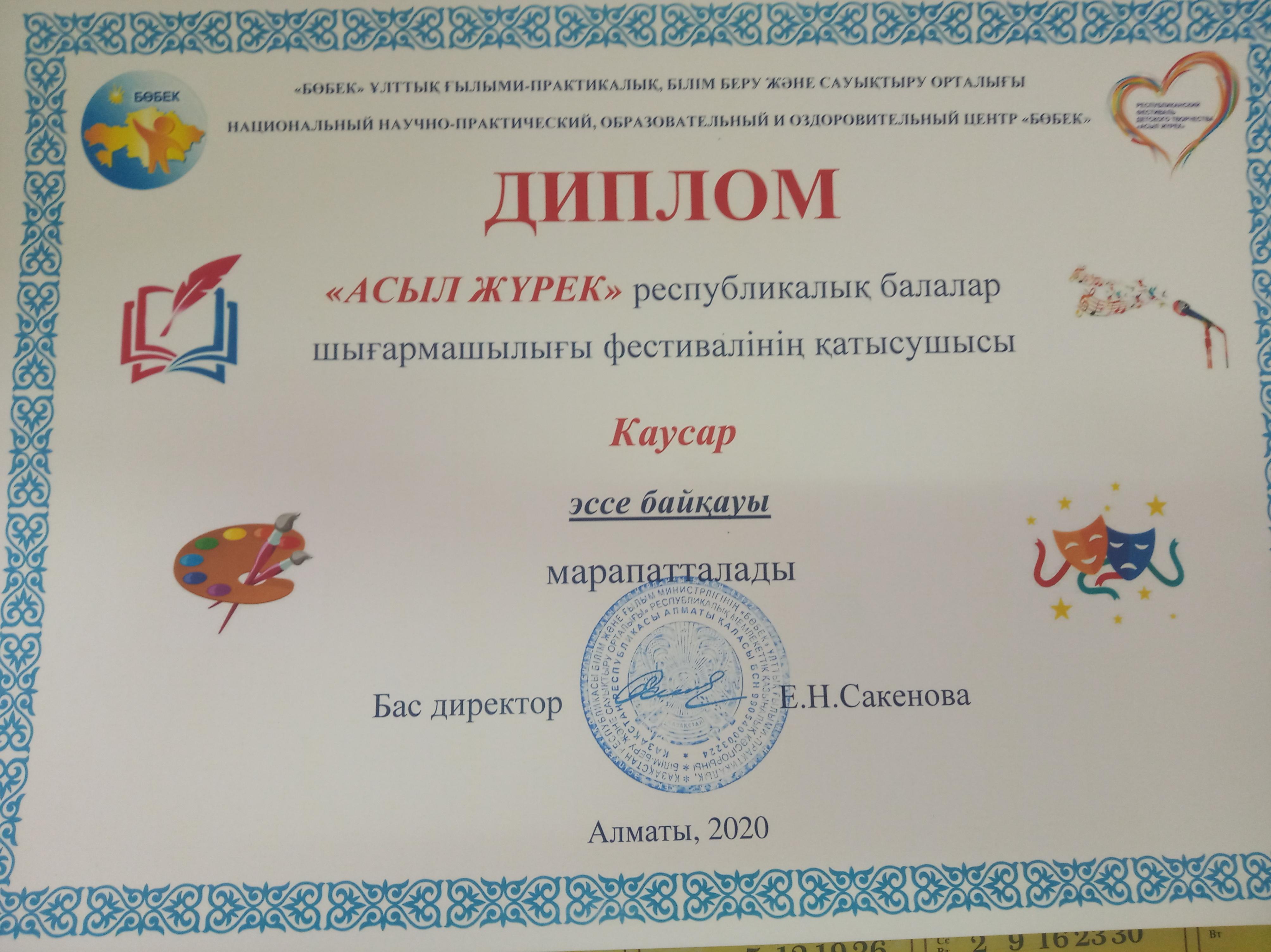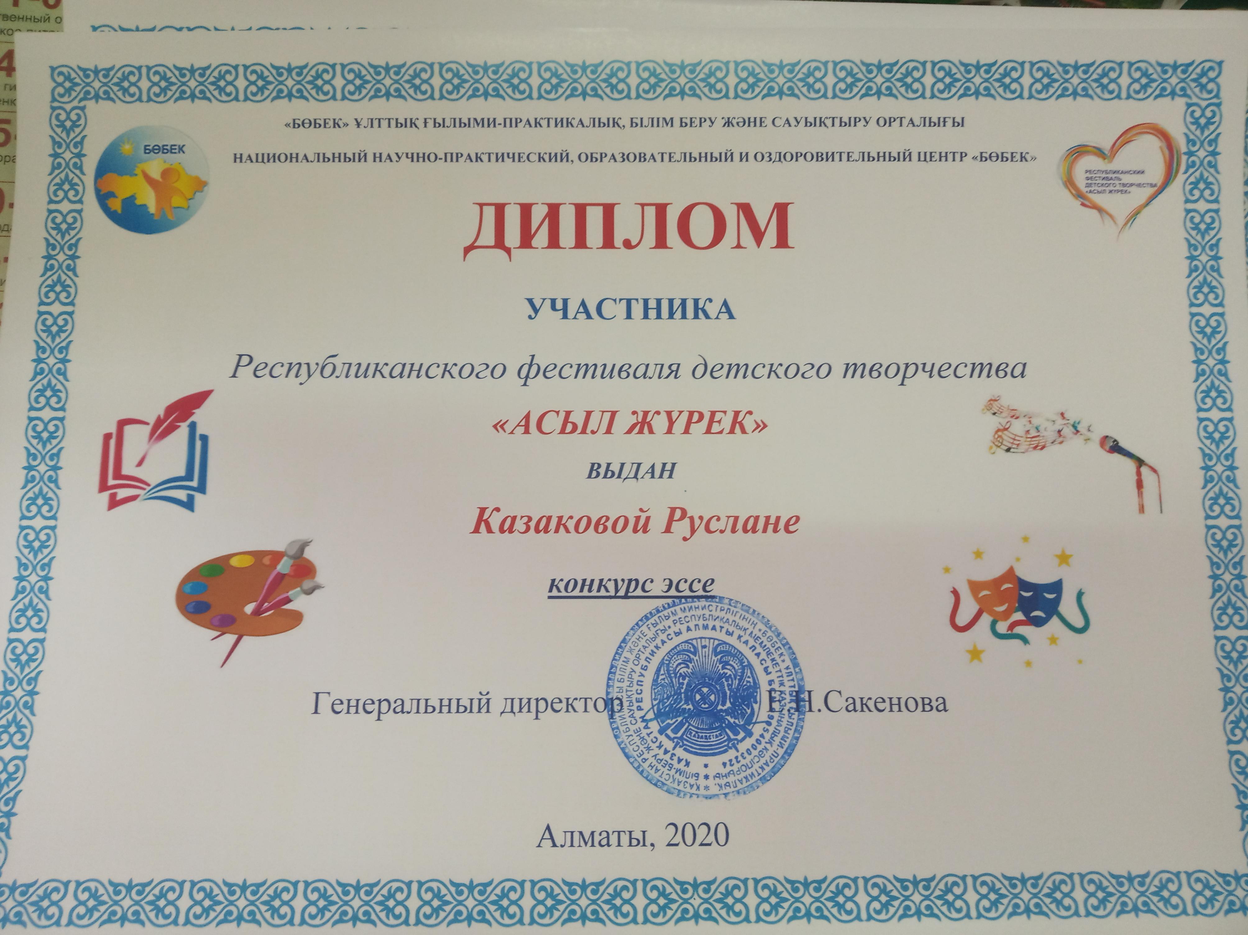 Учащиеся нашей школы приняли активное участие в республиканском фестивале "Асыл жүрек" организованный научно-практическим, оздоровительным центром "Бөбек". Конкурс-эссе «АЛТЫН ЖҮРЕК АНАМЫЗ», «СЕРДЦЕ, НАПОЛНЕННОЕ ЛЮБОВЬЮ»: Якупова Руфина, Казаков Руслан, Селезнева Мелитина. Диплом за подготовку участников заместителю директора по ВР Оразаевой А.С.