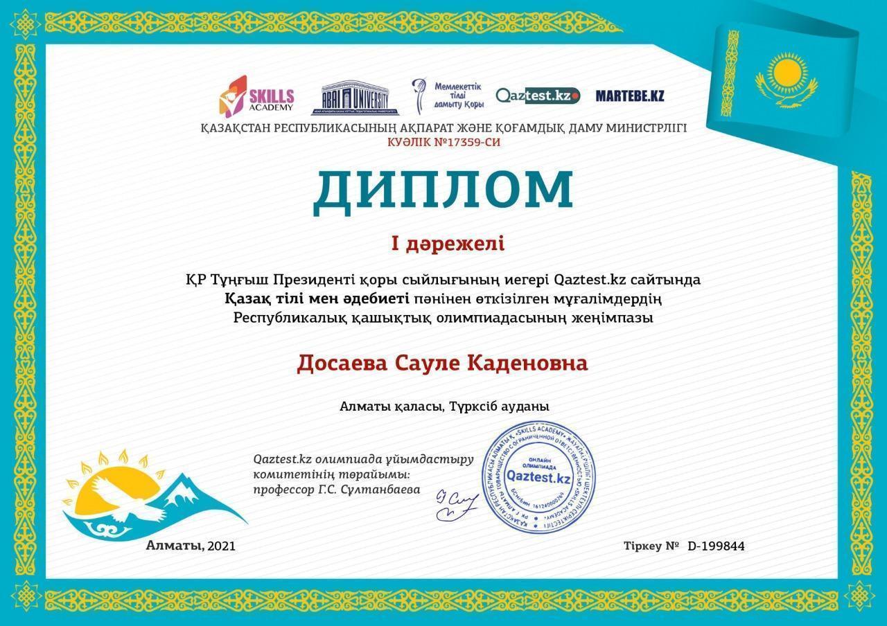 Педагоги нашей школы занимаются самообразованием. Учитель казахского класса Досаева С.К., награждена Дипломом, сертификатом за участие в республиканской, дистанционной олимпиаде.
