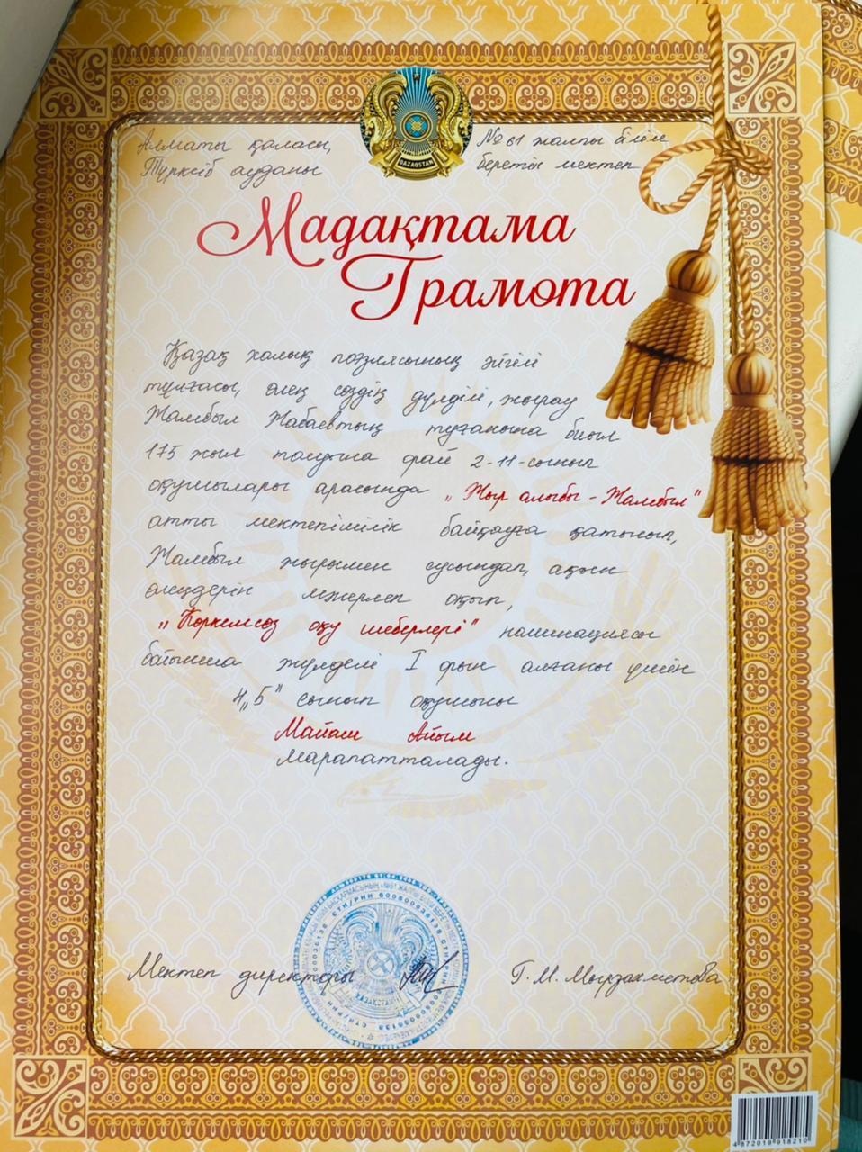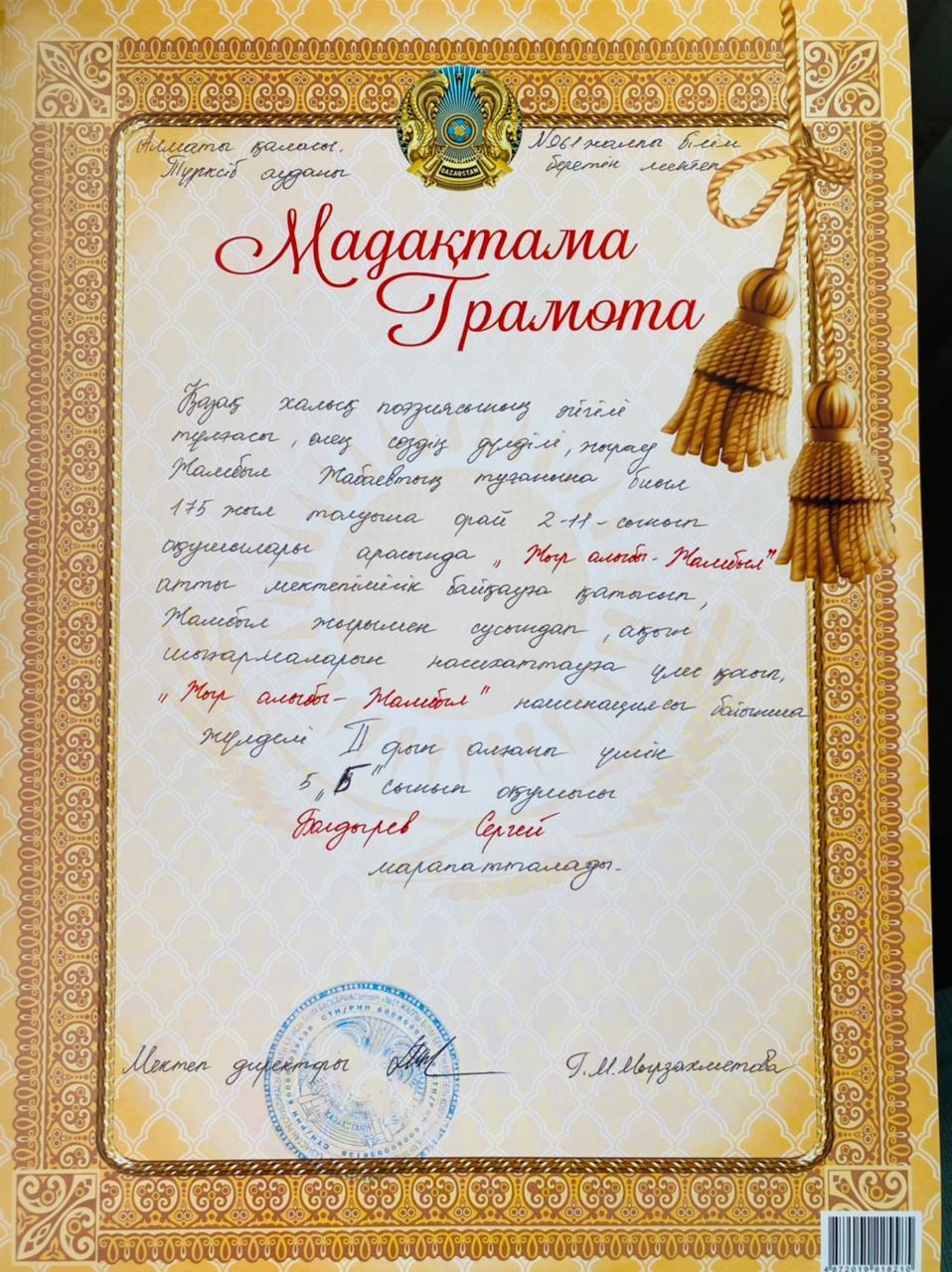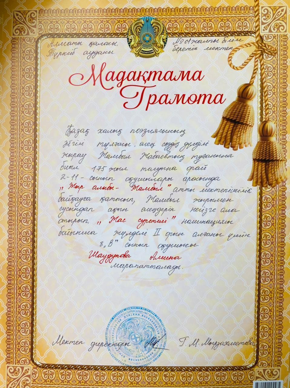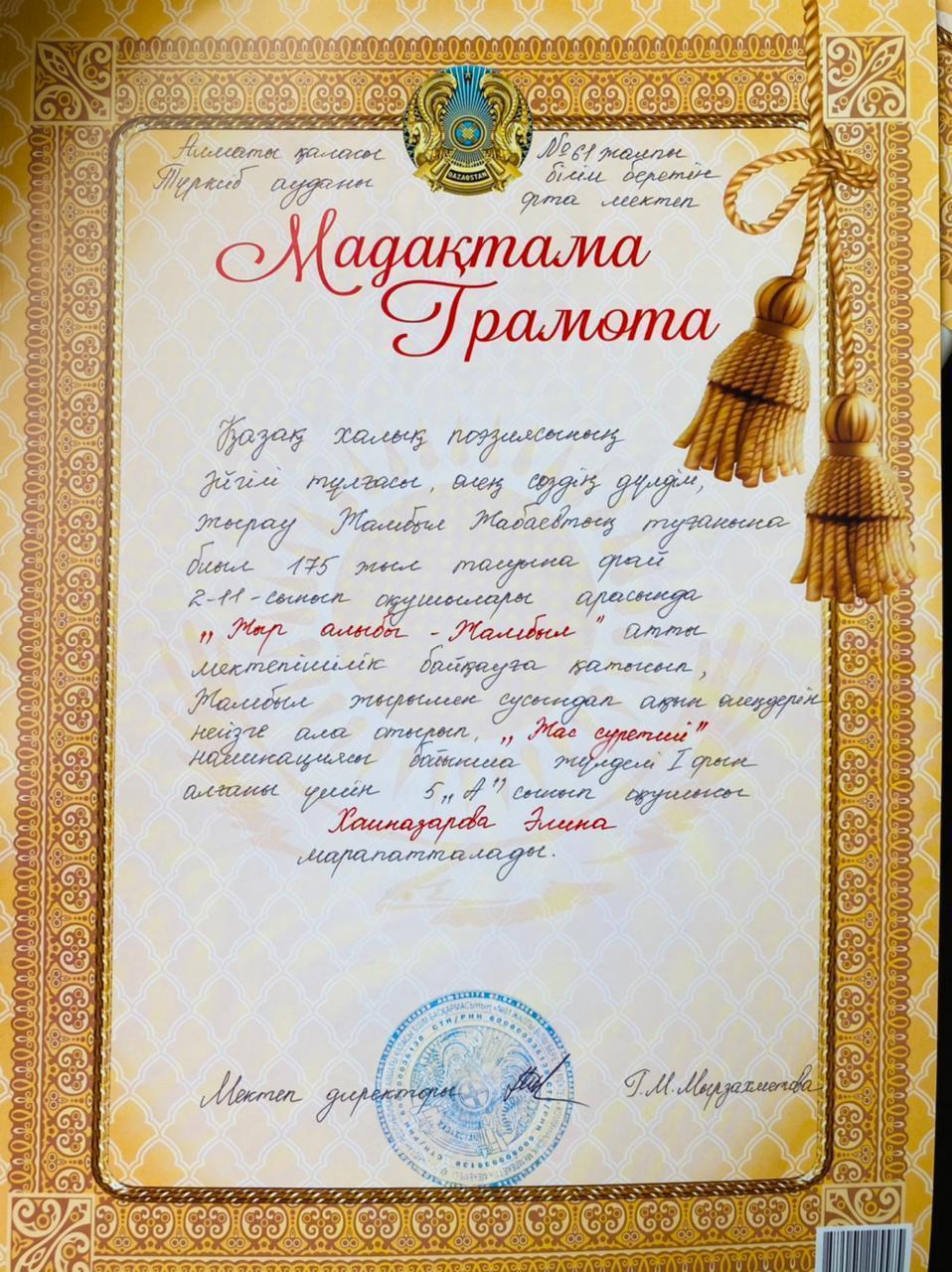 Жамбыл Жабаевтың 175 жылдығы Қазақ тілі мұғалімі Турусбекова Айман Серікқызы, Сәулетжан Айым