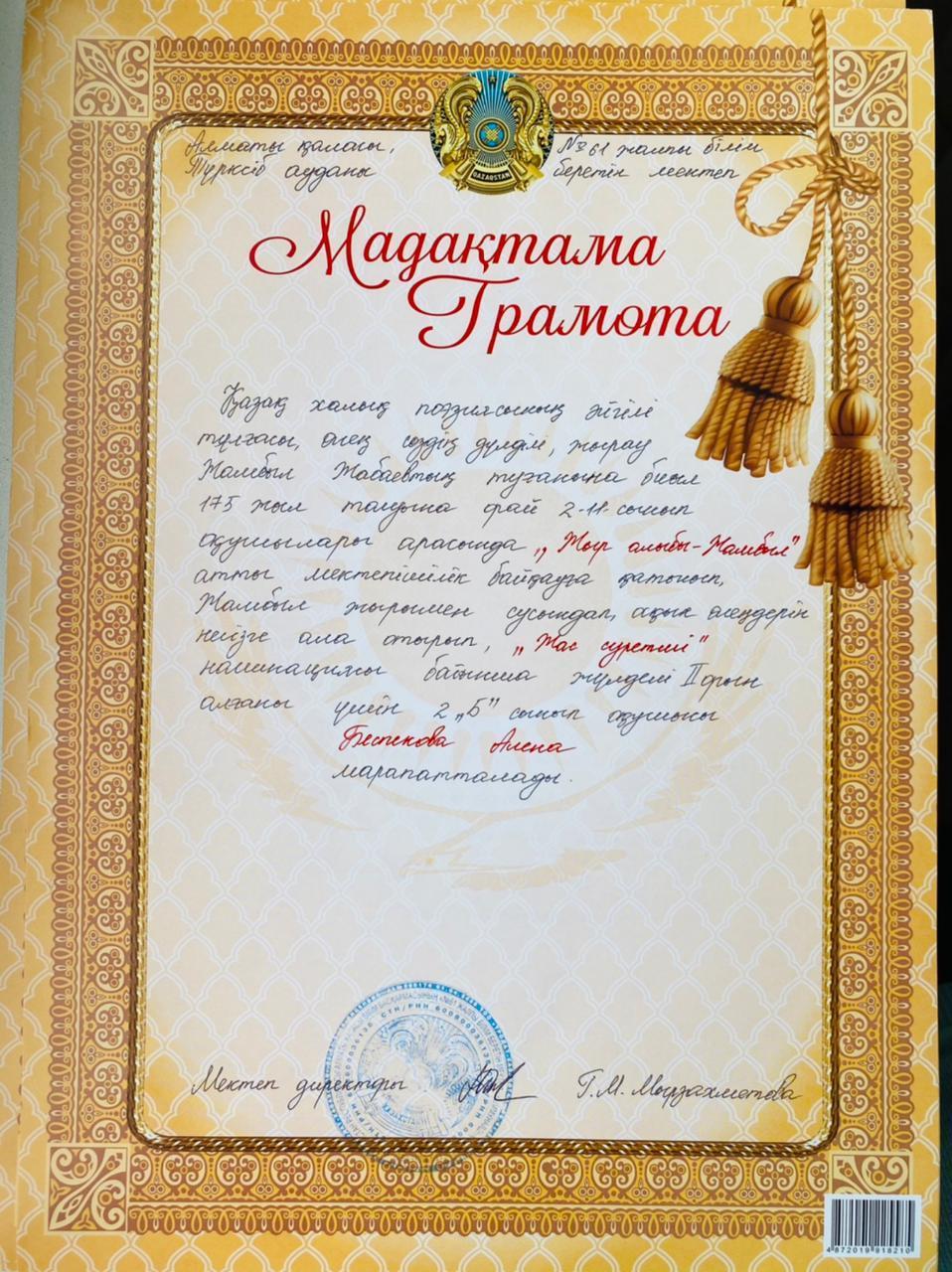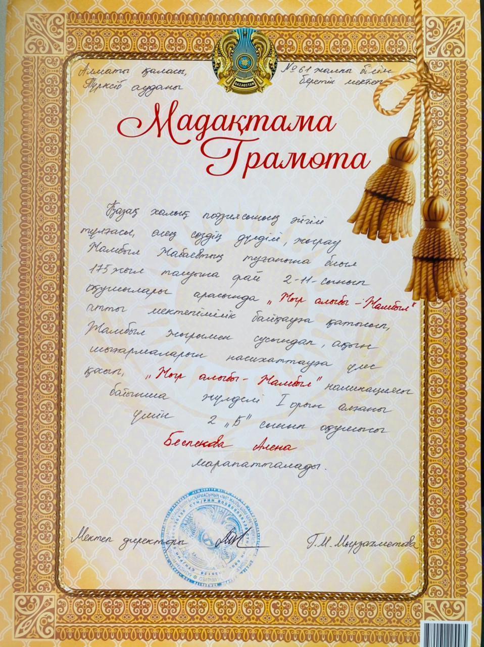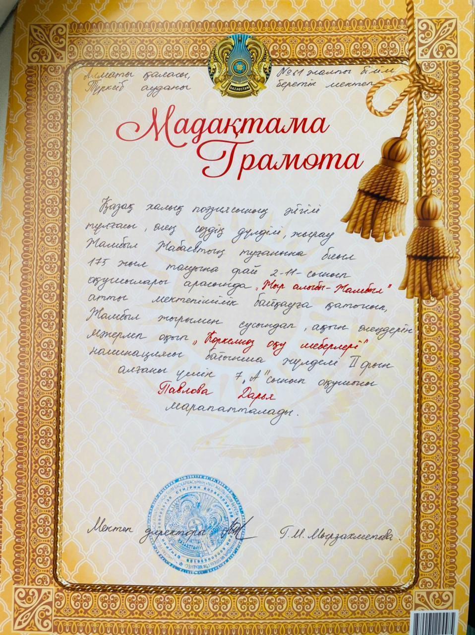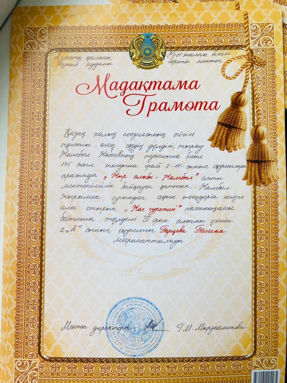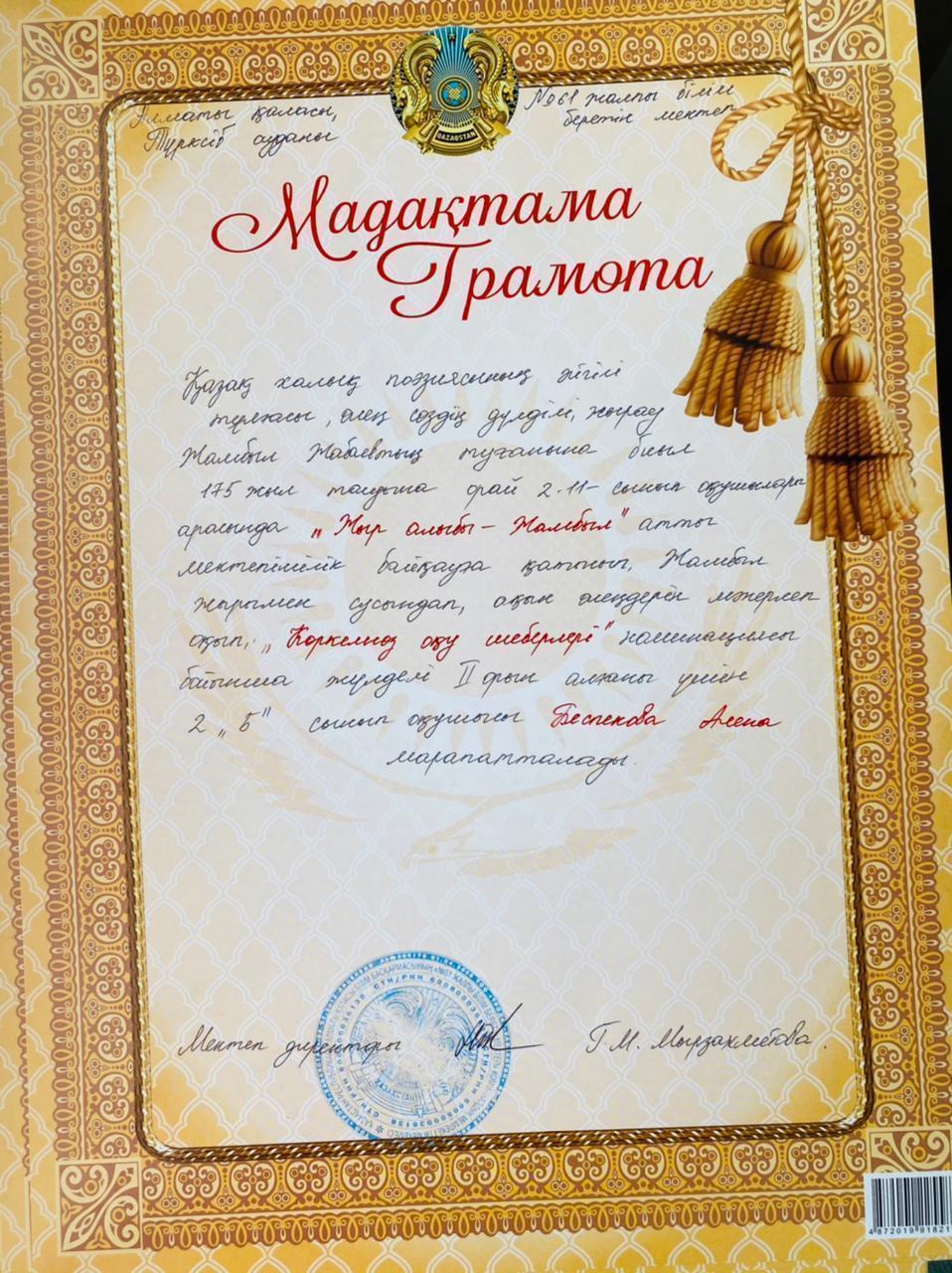 175-летию Джамбыла Джабаева учителя казахского языка Турусбекова Айман Сериковна, Сәулетжан Айым