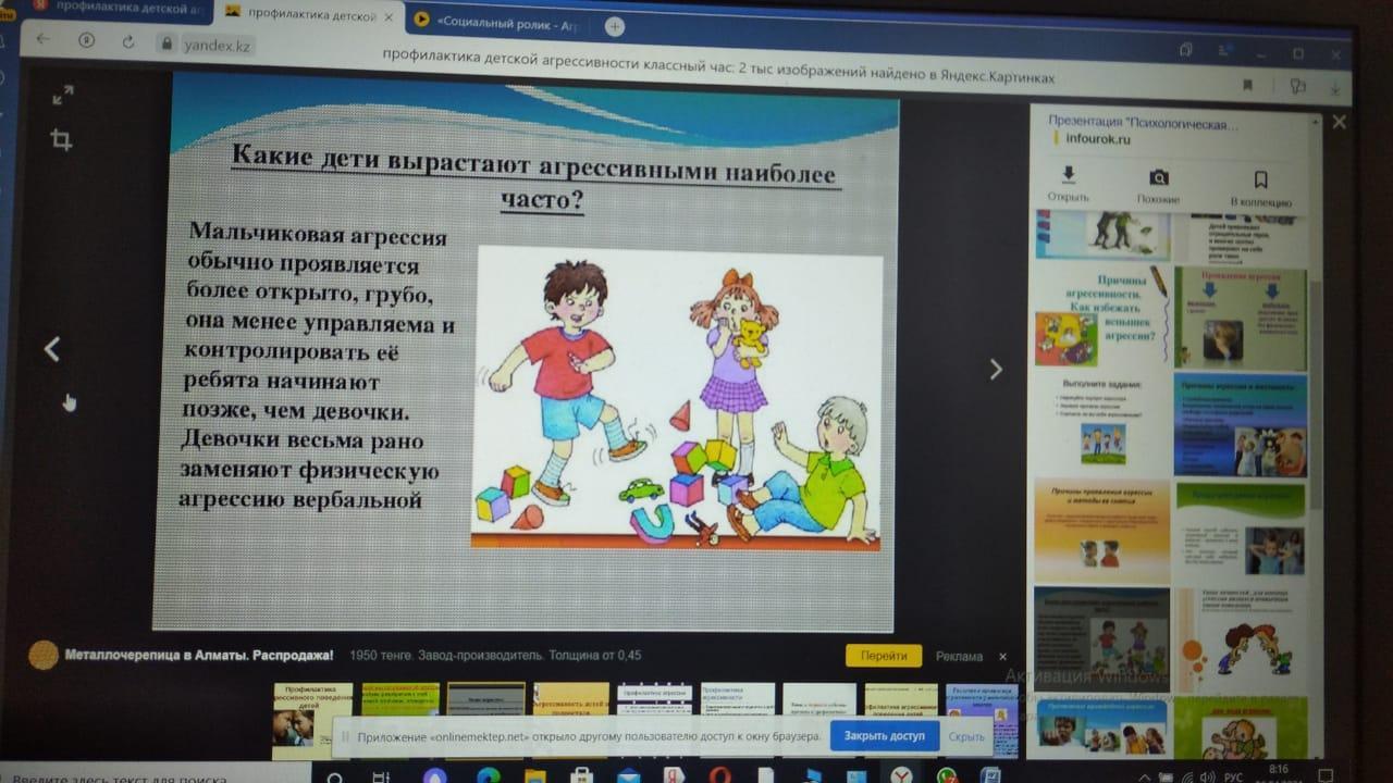 1-11 сынып жетекшілері 1-5 сынып оқушылары арасында"өрт қауіпсіздігі", "балалар агрессиясы", 6-11 сынып АИТВ-ЖИТС-тың алдын алу тақырыбында қарым-қатынас жасау үшін сынып сағатын өткізді.