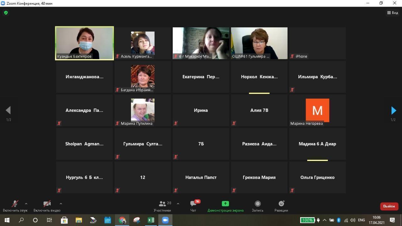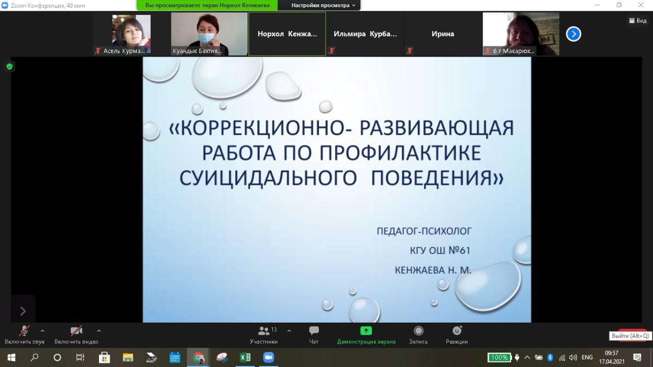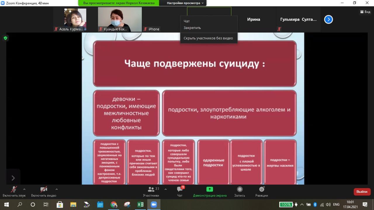 17 апреля 2021 года прошла онлайн встреча "Директорская суббота - голос родителей" с Представителями родительского комитета 6-9 классов. Тема обсуждения "Коррекционно -развивающая работа по профилактике суицидального поведения". На повестке дня обсудили с родителями такие вопросы: 1. ´Тема: «Коррекционно-развивающая работа по профилактике суицидального поведения», психолог школы Кенжаева Н.М.´2. Посещаемость учебного процесса. Заместитель директора по УР Бахтияров К.Ж., 3. Обратная связь – вопросы к директору школы. Количество родителей 38 человек.