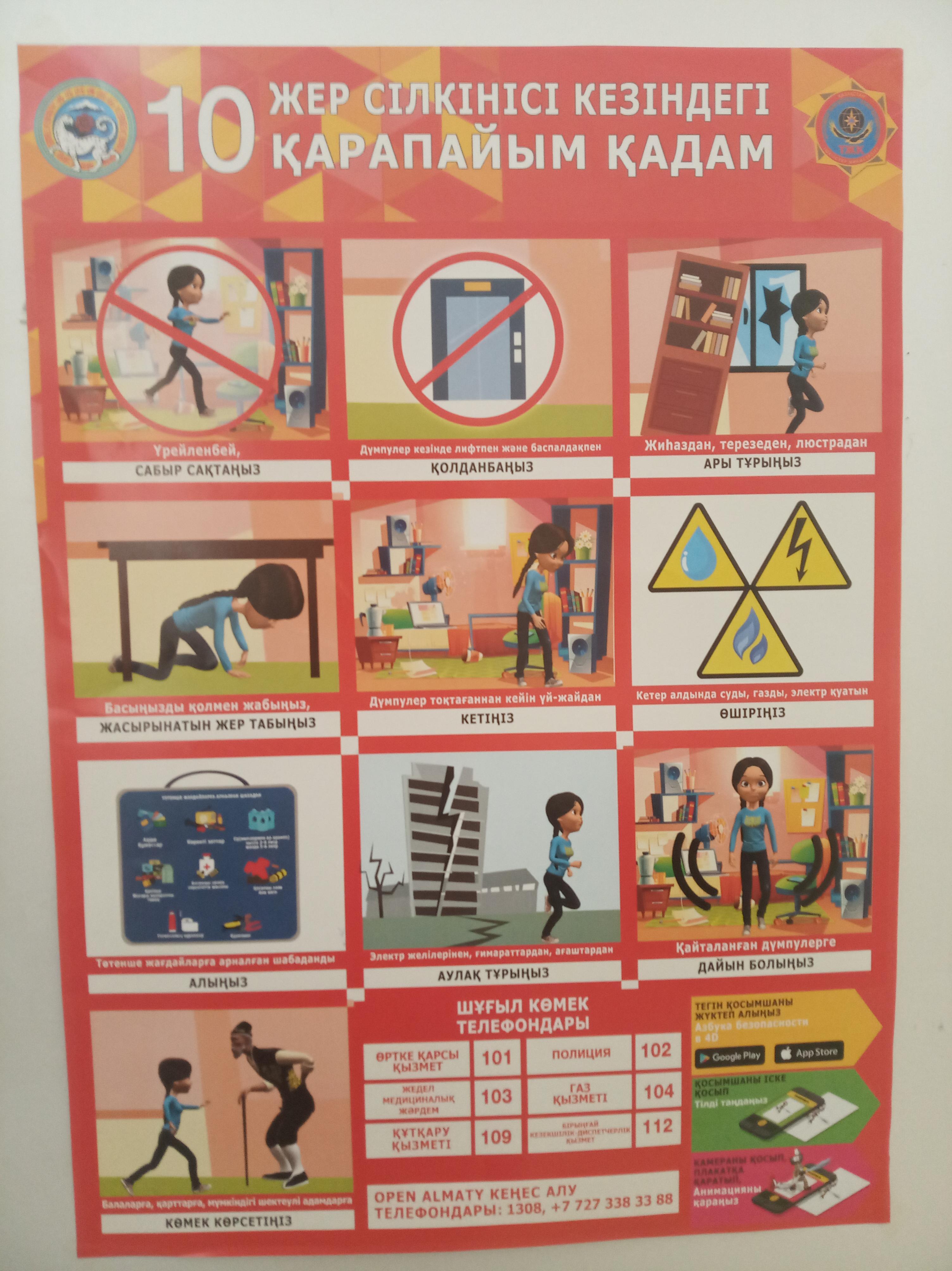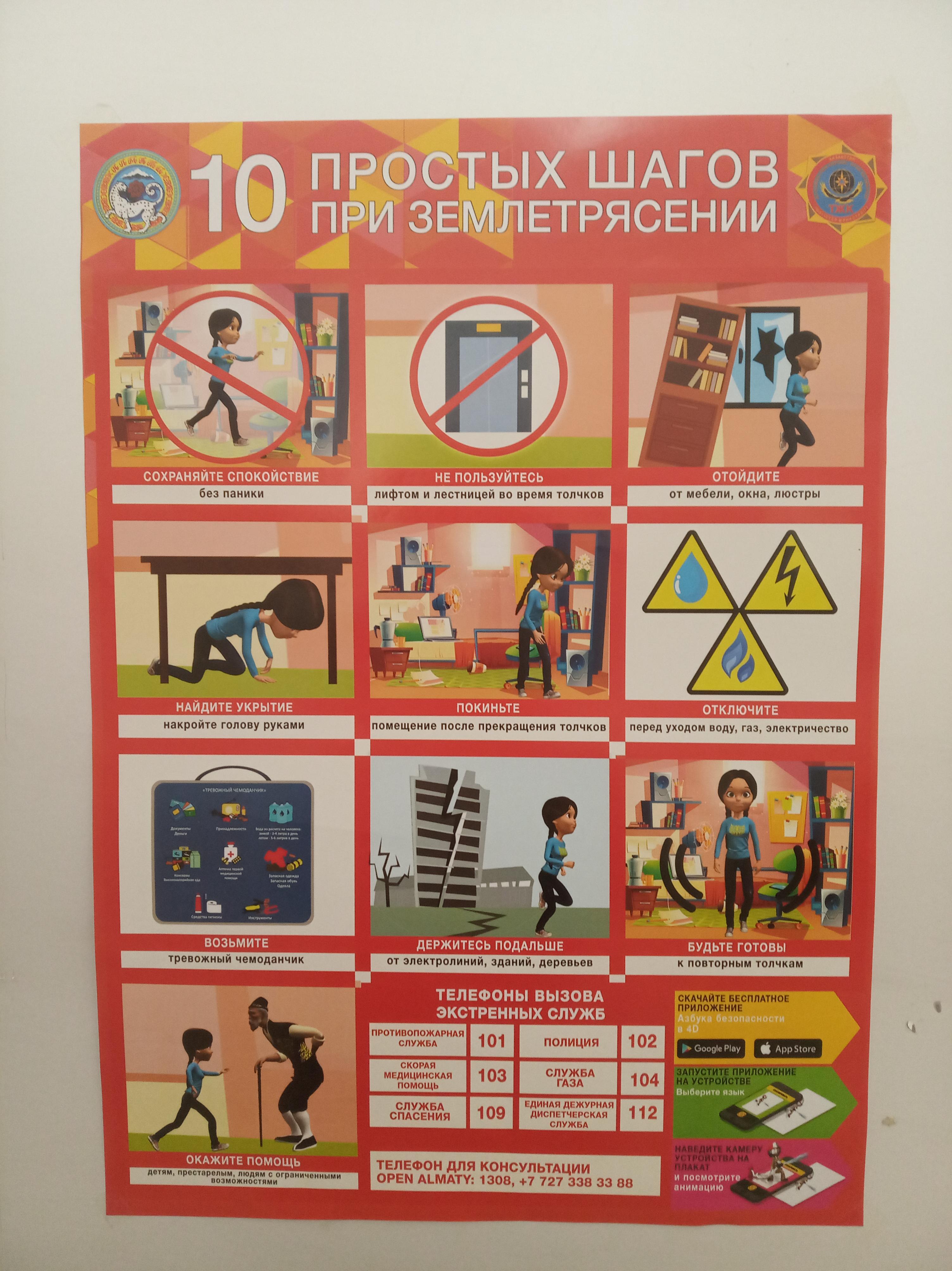 06 май 2021 0 1 2 3 4 5 10 қарапайым қадам/10 простых шагов При землетрясении ДЧС рекомендует:Сохранять спокойствие и не подаваться панике. ...Не пользоваться лифтом и лестницей при самих толчках.Отойти от мебели, окон и люстр.Найти укрытие в доме и накрыть голову руками.Перед уходом из здания по возможности отключить воду, газ и электричество в квартире. Осы беттің QR-коды:QR-код этой страницы: