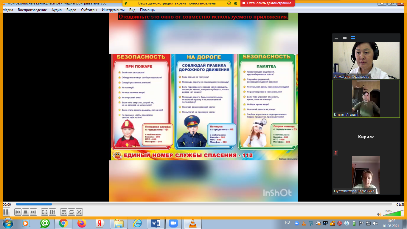 1 июня 2021г. с 1 – 11 класс провели внеплановый, праздничный классный час на тему: «1 июня Международный день защиты детей», «Каникулы без огня», «Мои безопасные каникулы». Количество учащихся – 564.