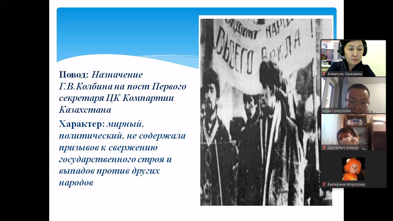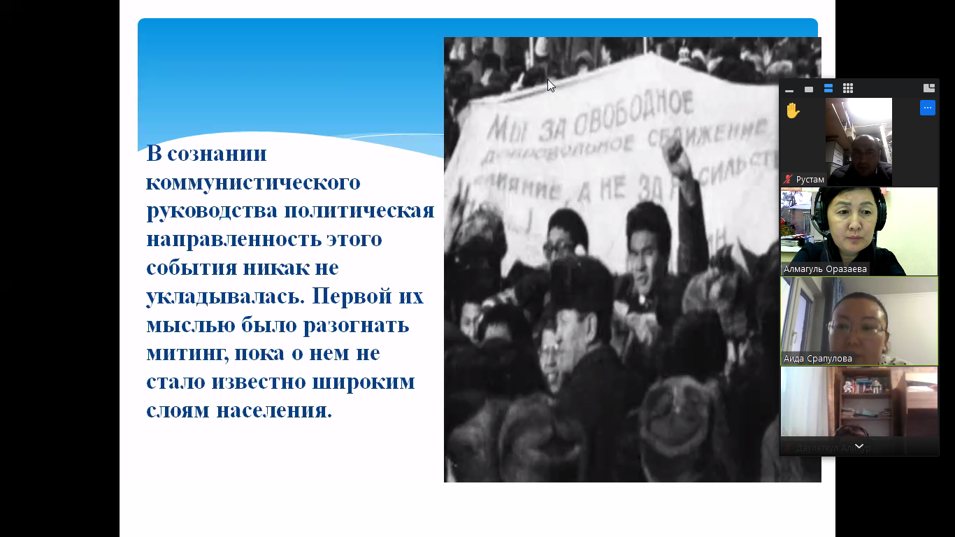 Учителя истории Срапулова А.С., Дюсенов Т.М., организовали зумконференцию для учащихся 5 - 7 классов на тему "Декабрьские события 1986г. в Казахстане, посвящено 35 - летию декабрьских событий". Присутствовали - 60 учащихся.