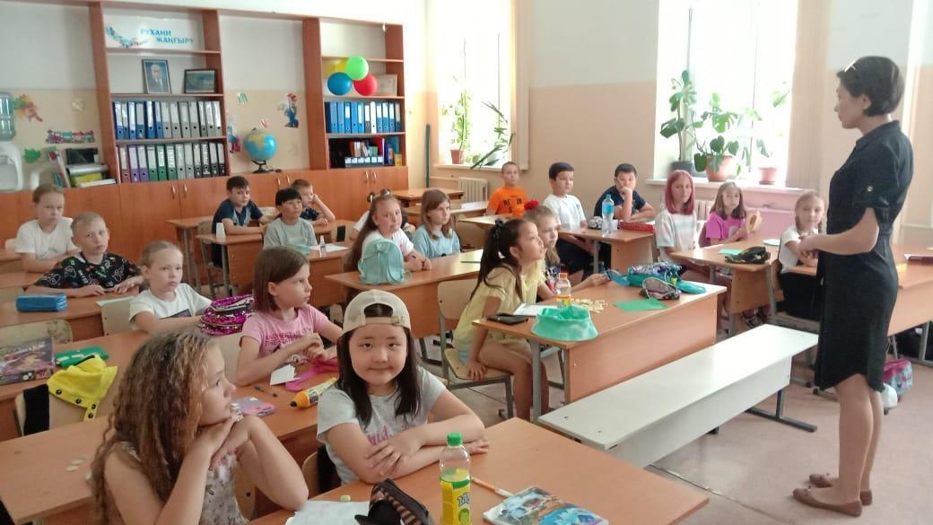 Уроки казахского языка в летнем лагере Алтын кун. Дети через игру знакомятся с новыми словами. Ведут диалог на казахском языке. Уроки проводят Абай Нурсултан, Айнаш Слямбековна.