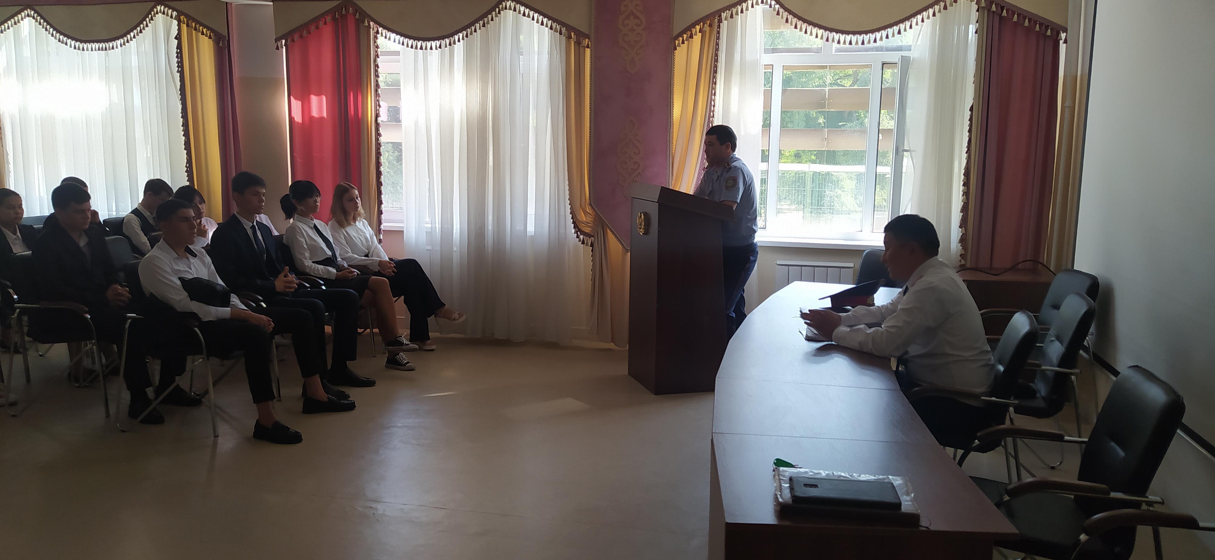Кәмелетке толмағандар ин жөніндегі мектеп инспекторы, полиция аға лейтенанты хметов Нияз Ержанұлы, полиция аға лейтенанты, тергеуші Асылханов Жасұлан Берікұлы 8-11 сынып оқушыларына "қылмыстық жауаптылық жасы", "есірткі қылмысының алдын алу", "зорлық-зомбылықтың құрбаны болмау және өз құқықтарын қорғау үшін қайда жүгіну керек"тақырыптарында кәсіби сұхбат өткізді