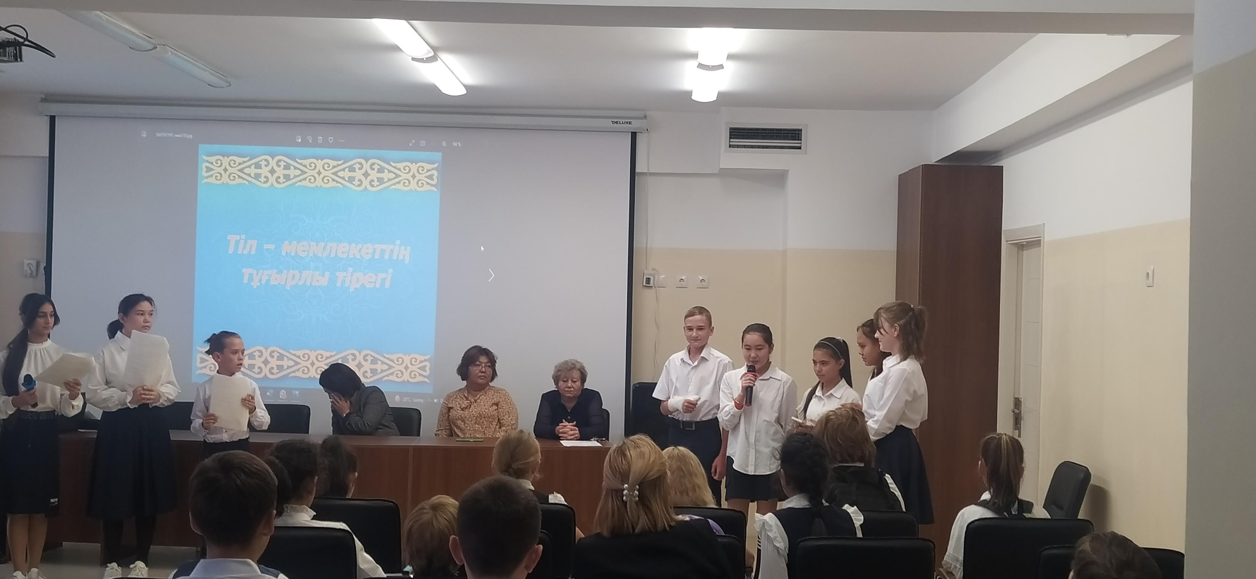В честь недели языка в конференц-зале провели открытие Дня языка. Учителя гуманитарного цикла организовали концертную программу с участием учащихся 7-х классов. Ведущие выступали на трех языках. Учащиеся 6-х классов читали стихотворения о языке народов. Ученик 9в класса Оразай Санжар исполнил музыкальную композицию на домбыре. Открытие прошло на высоком уровне.
