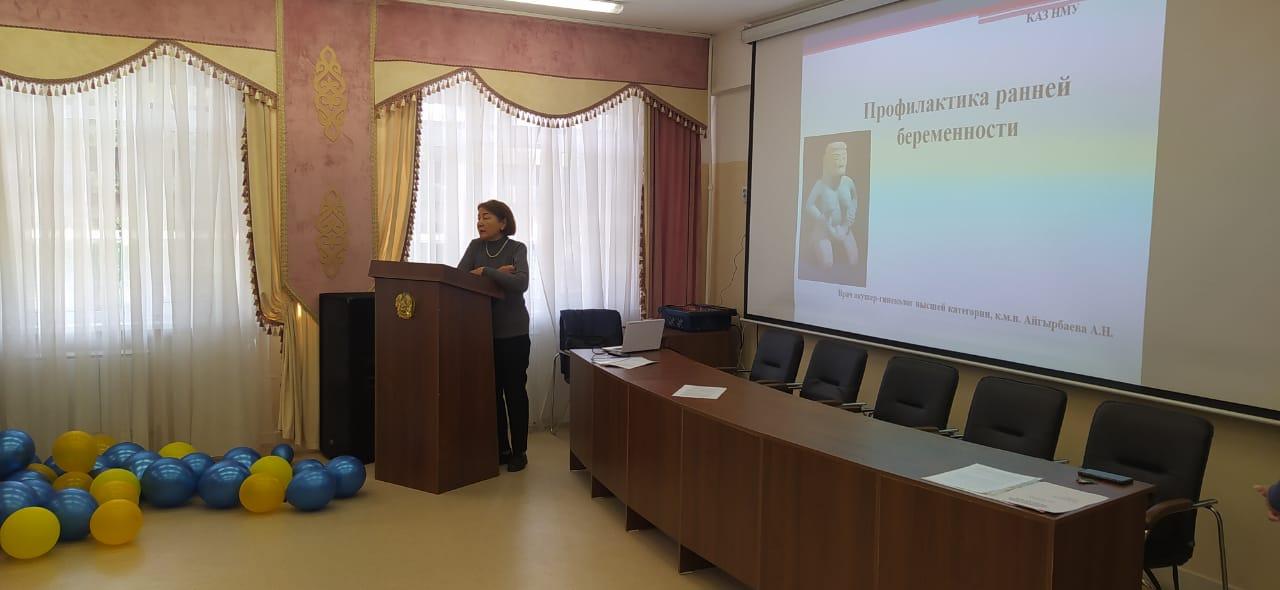 МБОУ СОШ № 61 с девочками 8-11 классов на тему "Профилактика ранней беременности". Беседу провела акушер-гинеколог высшей категории, к. м. н., преподаватель Айгырбаева А. Н.