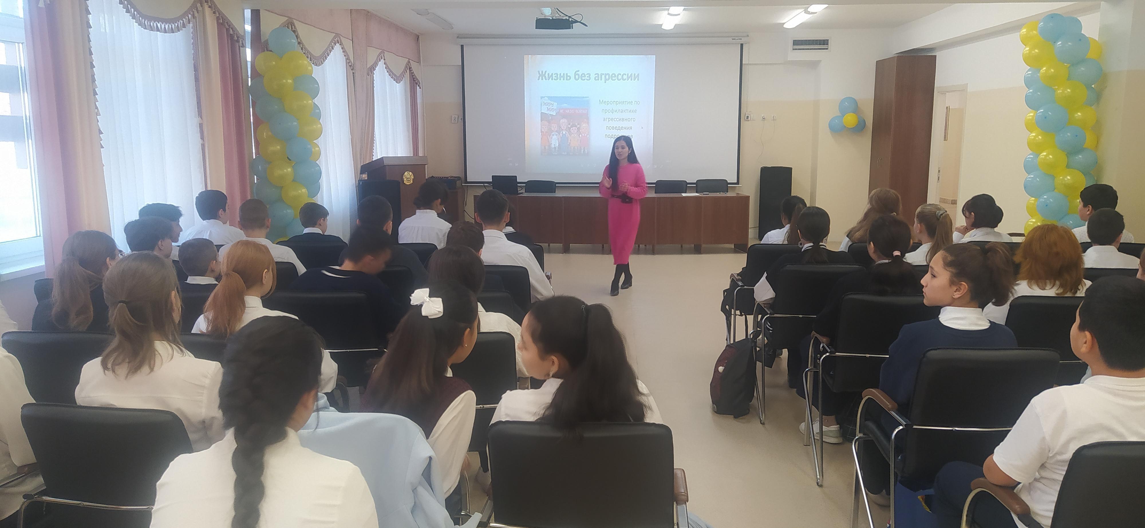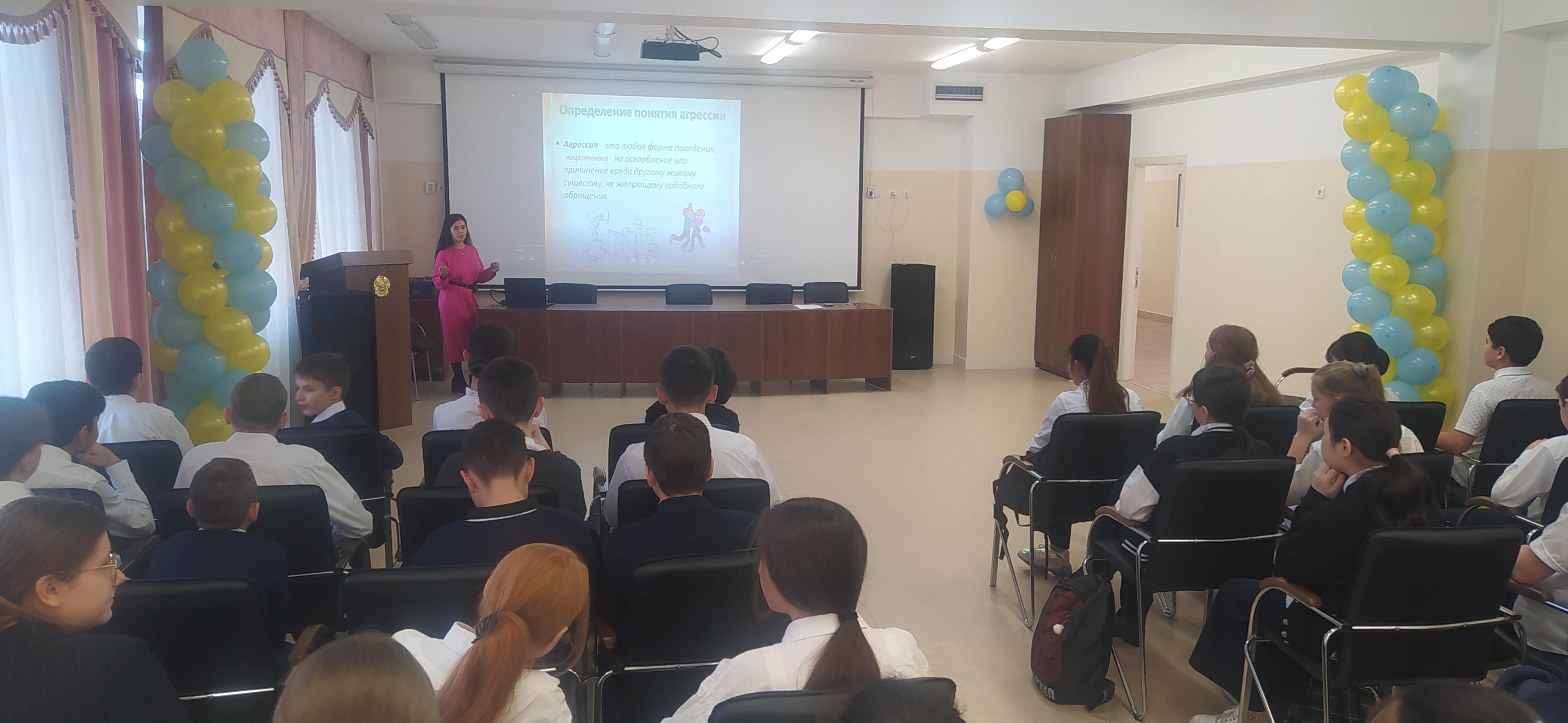 Мектеп психологы Кенжаева Н. М., 7б, 7в, 7г, 7д оқушыларымен "Агрессияға қалай қарсы тұруға және жанжалды шешуге болады? Тренингтің мақсаты-балаларды кез-келген жағдайда олардың жағдайын реттеуге үйрету. Агрессияға қарсы тұру және жанжалды шешу әдістерімен таныстырды. Балаларға стресске қарсы тұра алатын дәрі-дәрмектер туралы хабарлады.