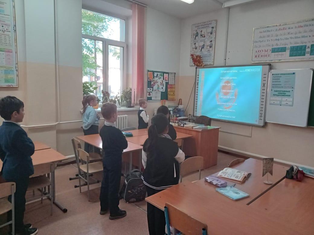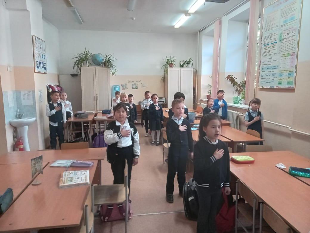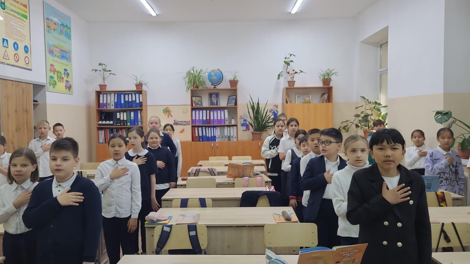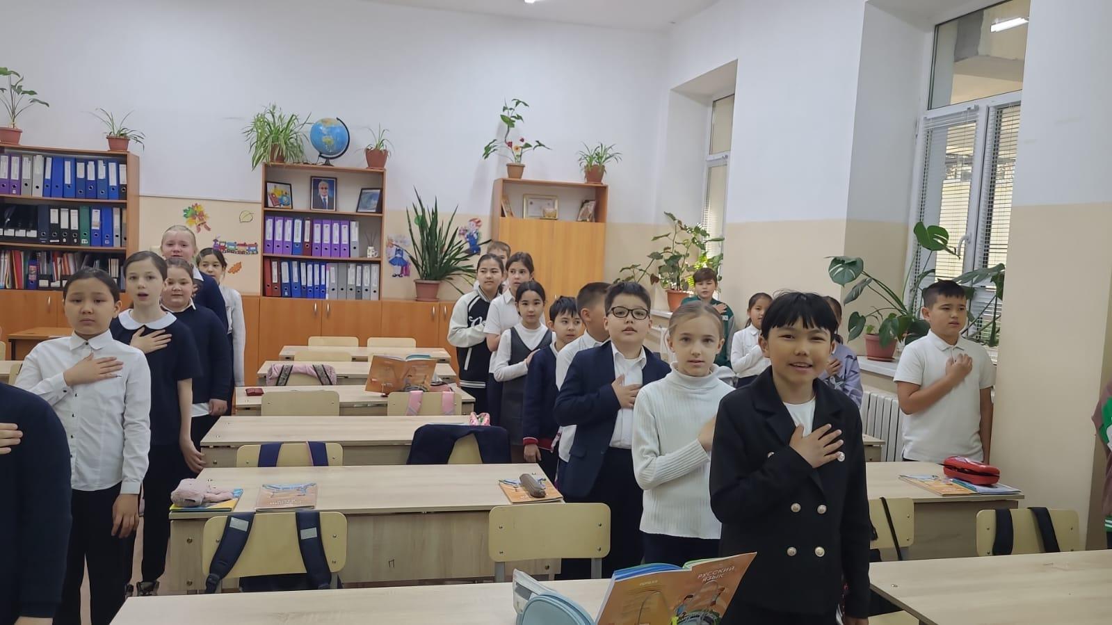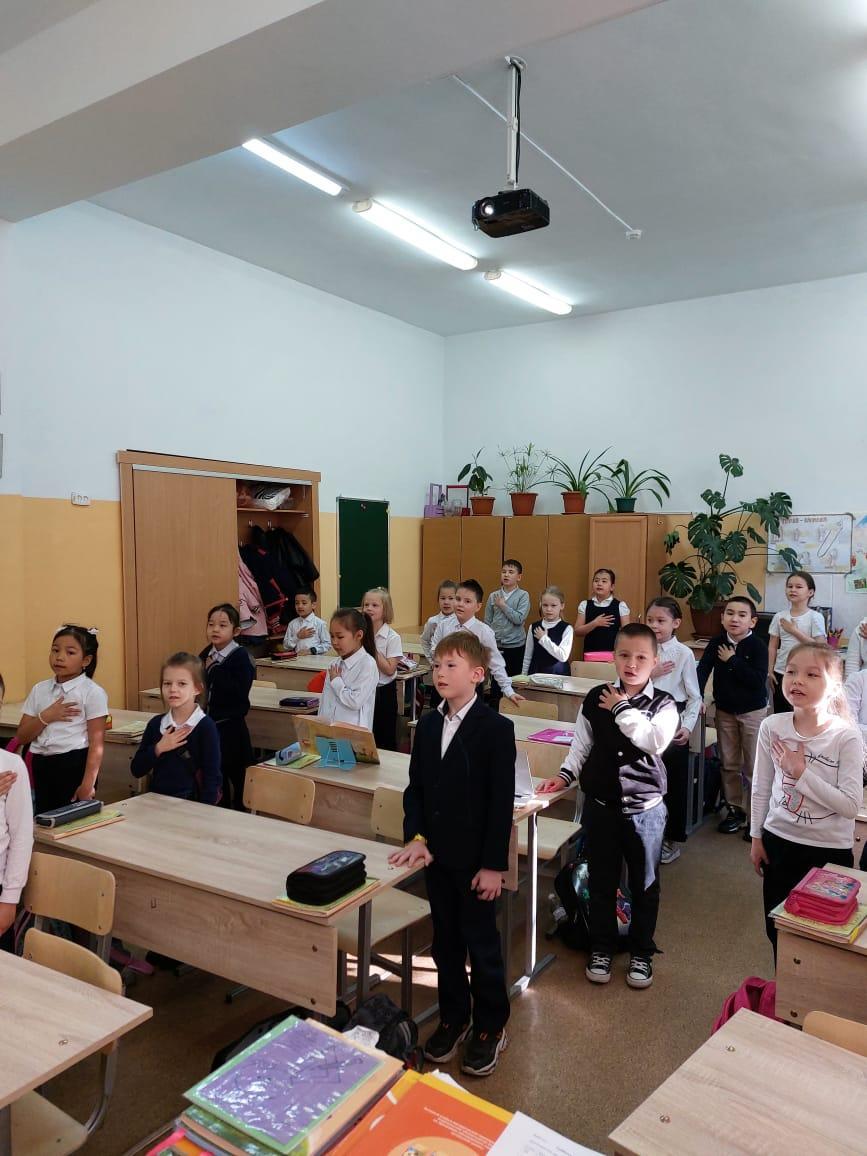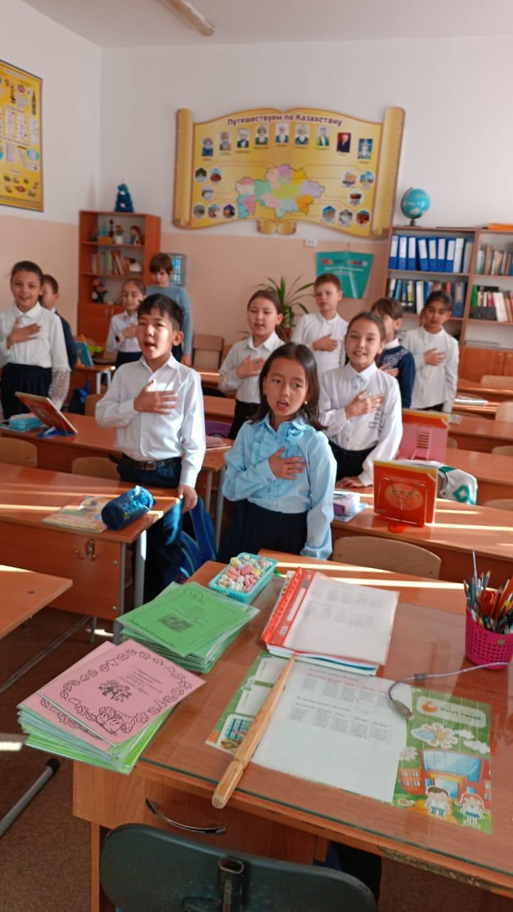 1-11 сынып оқушылары Отан қорғаушылар күніне және ҰОС Жеңіс күніне арналған ҚР Мемлекеттік Әнұранын орындады. Учащиеся 1-11 классы исполнили государственный гимн РК посвященный Дню защитников Отечества и Дня Победы ВОВ.