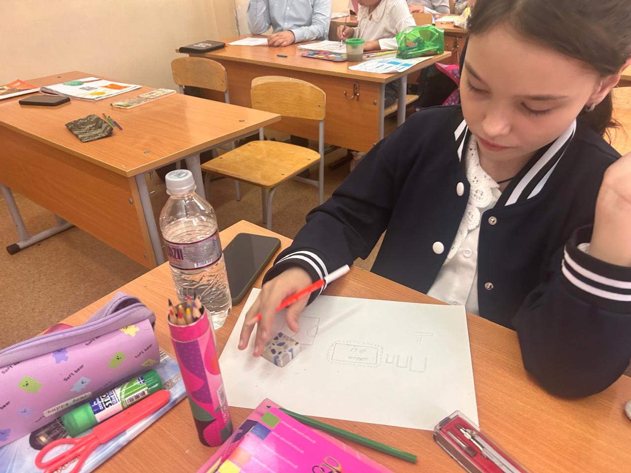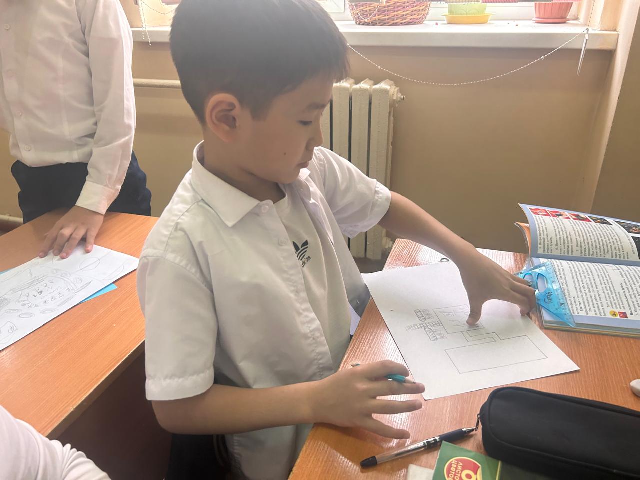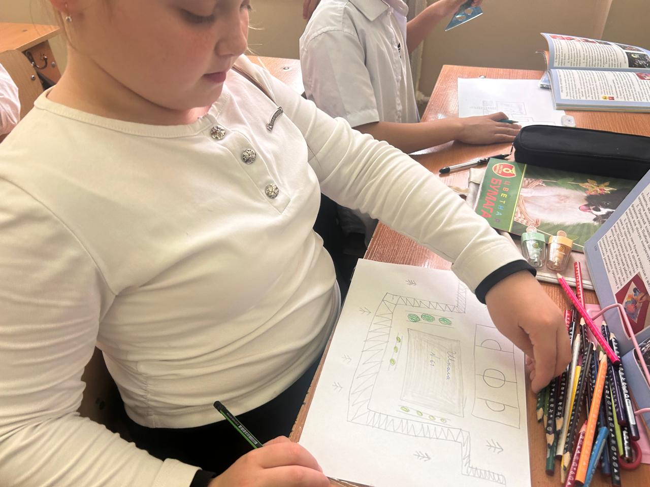 4В сынып оқушылары "мектеп ауласының оазисі" жобалар фестивалінің қатысушылары. Балалар өз мектебінің ландшафты дизайны туралы өз идеяларын салды. Учащиеся 4В класса участники фестиваля проектов "Оазис школьного двора". Дети нарисовали свое представление о ландшафтном дизайне своей школы.