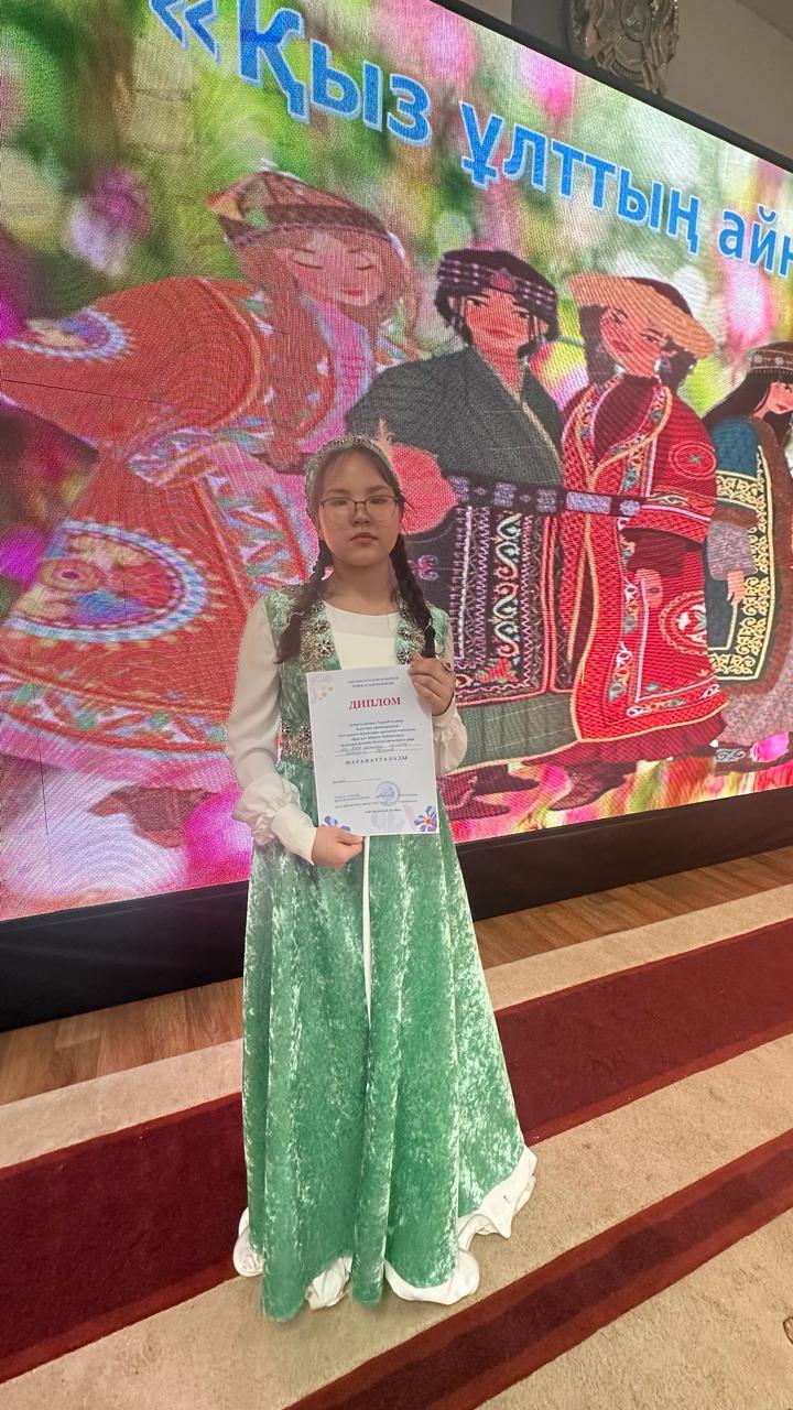Ученица 9а класса Сейткәрім Нүрдана приняла активное участие в районном конкурсе "Қыз - ұлттың айнасы". Нүрдана была награждена Дипломом за активное участие.