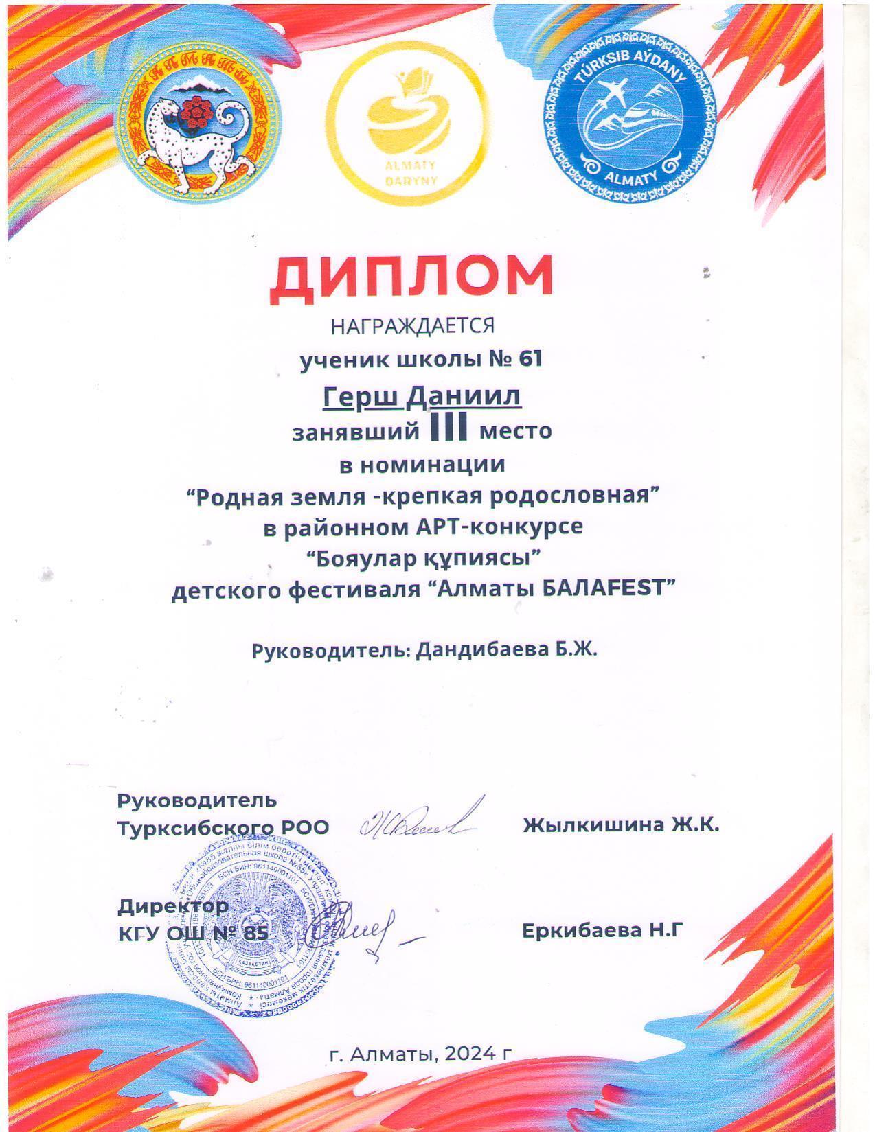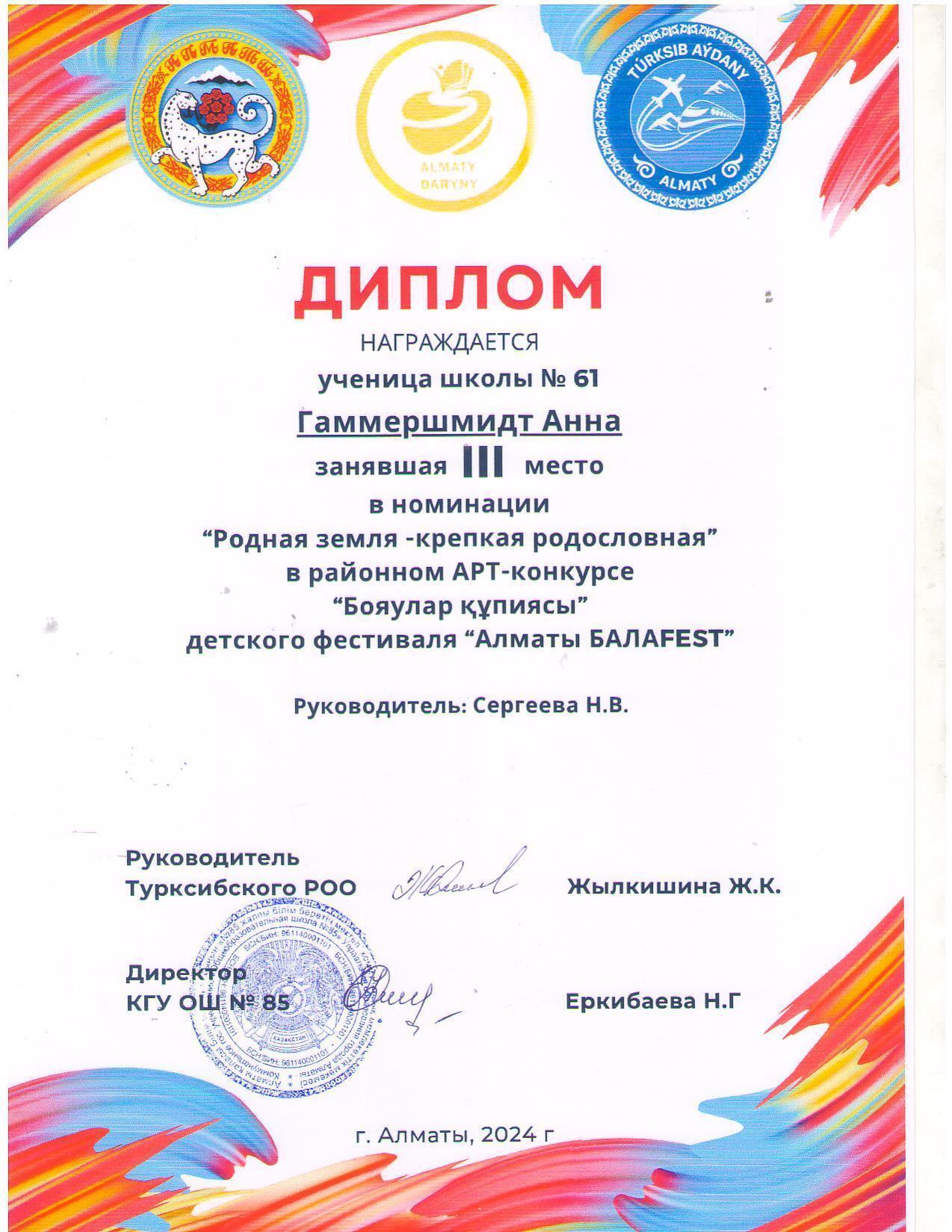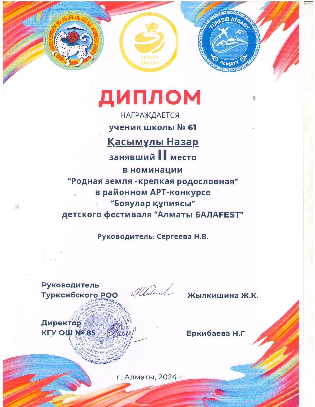 БалаFEST жетістіктері: "Жұлдызды сәт "байқауына қатысушылар Лапшин Е., "Бояулар құпиясы" Борецкая С., Қасымұлы Н., Гуммершмидт А., Герш Даниил," Кітап - білім көзі","Жасыл АЛМАТЫ", Борецкая с., Қасымұлы Н., Гуммершмидт А., Герш Даниил,"Кітап - білім көзі".