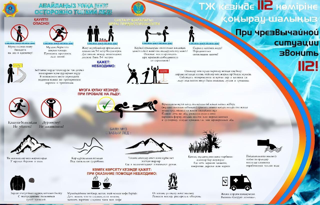 Тыйым салынады: мас күйінде мұзға шығуға, мұзда секіруге және жүгіруге, бір нүктеде көп адам жиналуға, өзендерде пайда болған жұқа мұзға жылдам ағынмен шығуға.