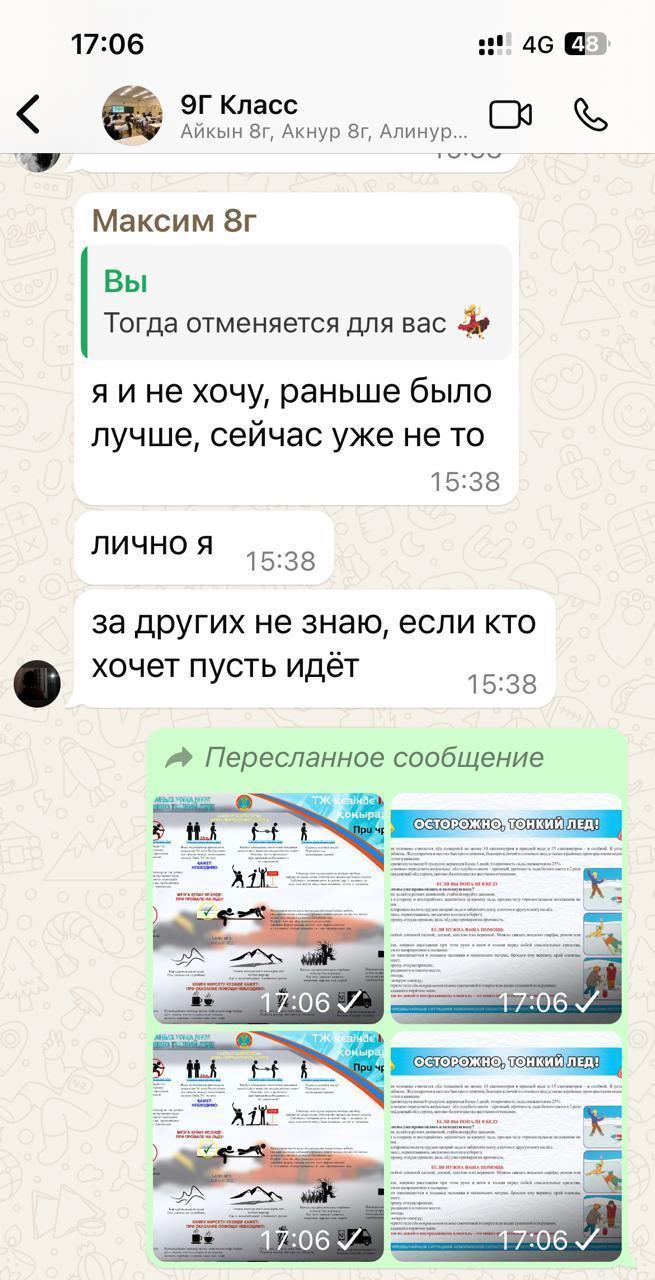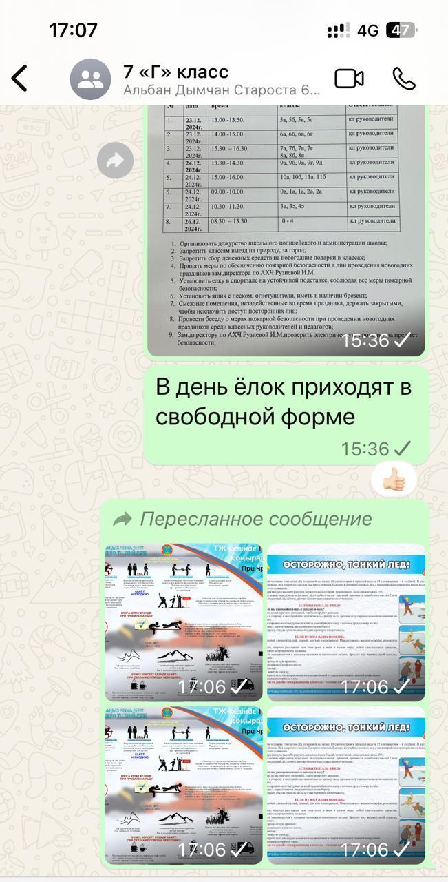 1-11 сынып жетекшілері ата-аналарға арналған қысқы демалыста қауіпсіздік техникасы бойынша нұсқаулық өткізді. Нұсқаулық тақырыптары: жұқа мұз, бұқаралық іс-шаралар, пиротехника, теміржол, "демалыс"рейд.
