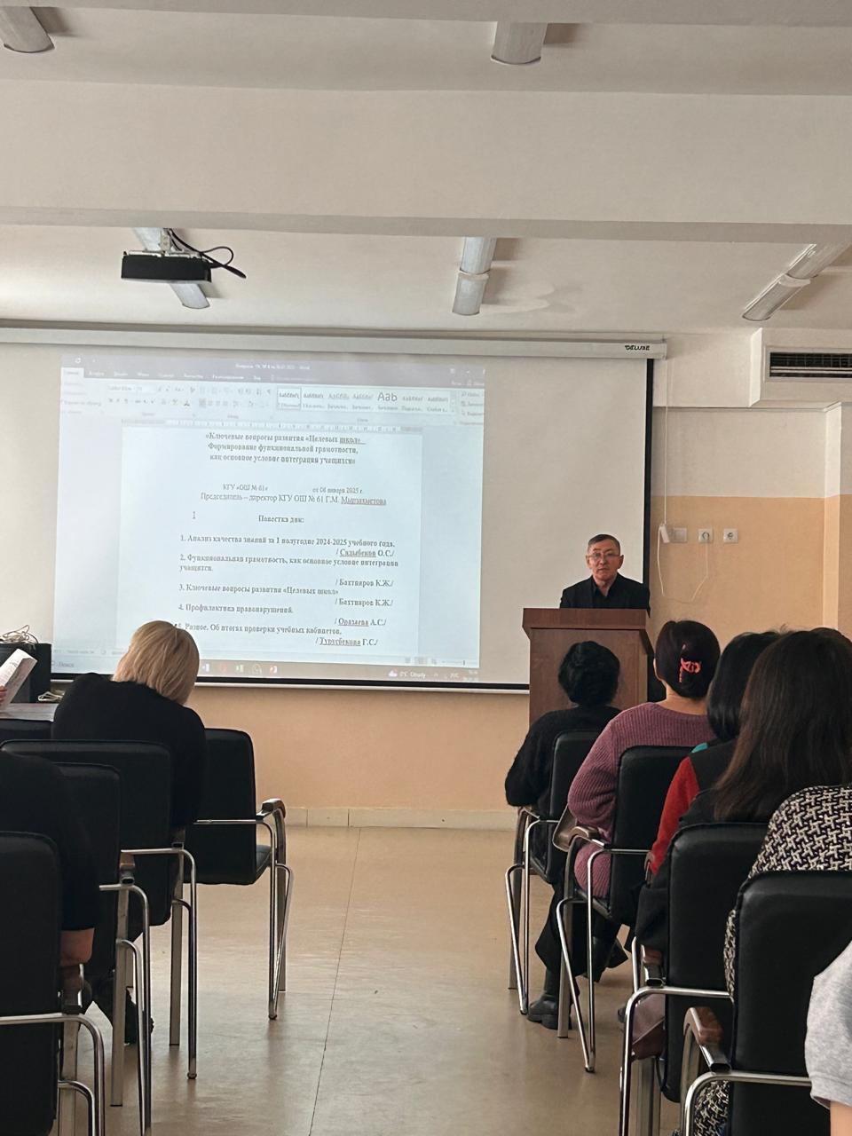 Бүгін 2024 жылдың 2 тоқсанының қорытындысы бойынша педагогикалық кеңес өткізілді. Күн тәртібінде: мақсатты мектептерді дамытудың негізгі мәселелері. Оқушылардың интеграциясының негізгі шарты ретінде функционалдық сауаттылықты қалыптастыру. Күн тәртібінде: 2024-2025 оқу жылының 1 жартыжылдығындағы сапаны талдау. Садыбеков О.С., функционалдық сауаттылық, оқушылардың интеграциясының негізгі шарты ретінде. Бақтияров К.Ж., "нысаналы мектептерді" дамытудың негізгі мәселелері, Бақтияров К.Ж., құқық бұзушылықтардың алдын алу Оразаева А.С..Сегодня провели педсовет по итогам 2 четверти 2024 года. На повестке дня: Ключевые вопросы развития целевых школ. Формирование функциональной грамотности, как основное условие интеграции учащихся. На повестке дня: анализ качества за 1 полугодие 2024-2025 учебного года. Садыбеков О.С., функциональных грамотность, как основное условие интеграции учащихся. Бахтияров К.Ж., ключевые вопросы развития «Целевых школ», Бахтияров К.Ж., профилактика правонарушений Оразаева А.С.