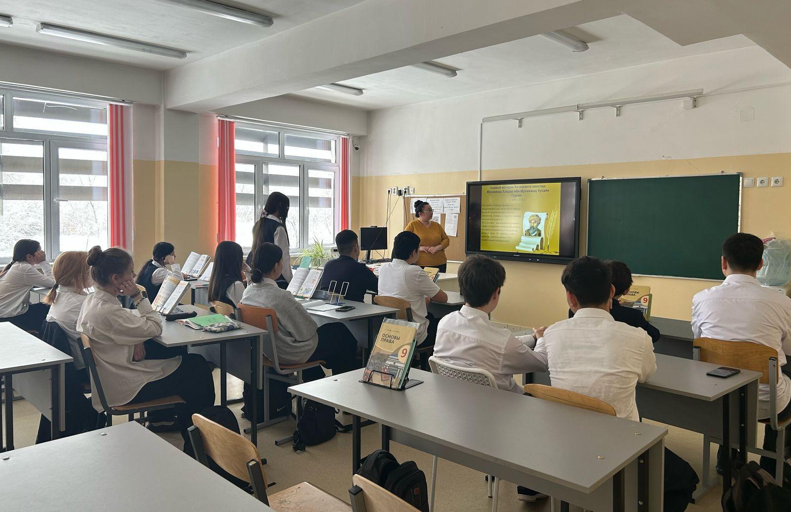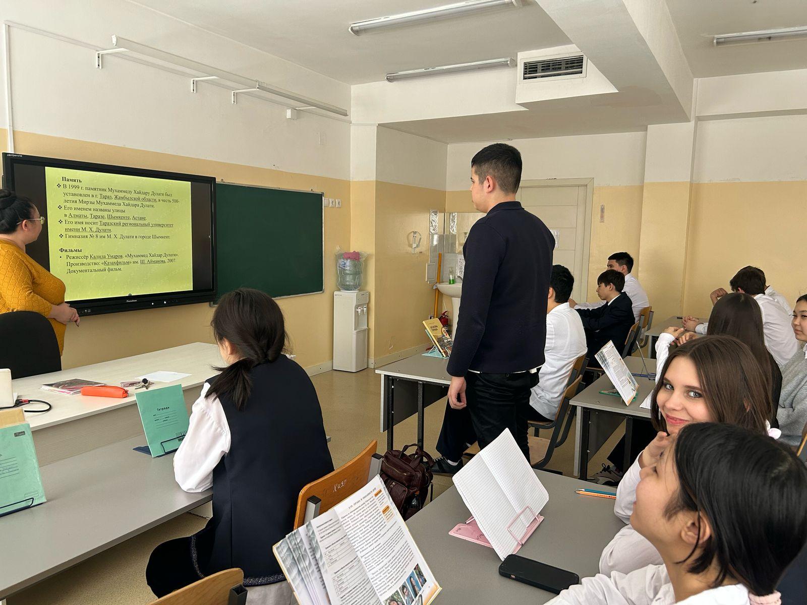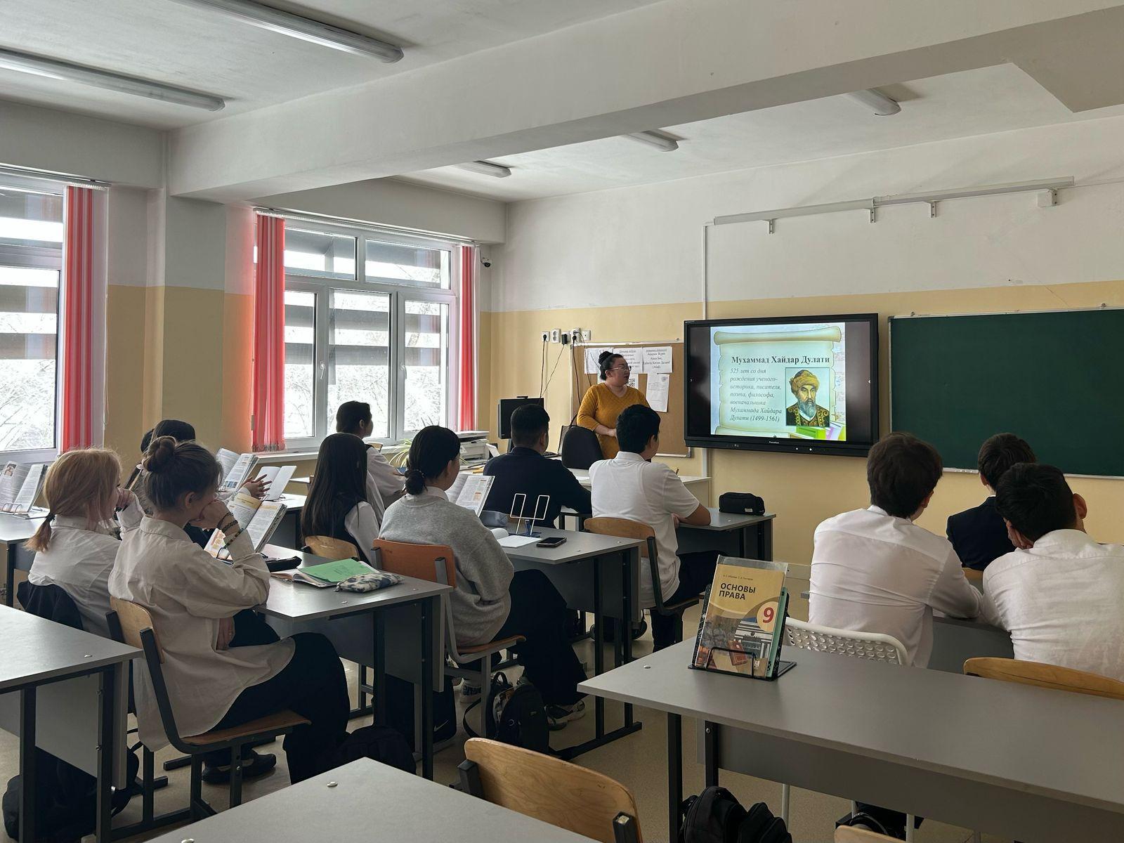 | Тарих пәнінің мұғалімі А. С. Сарапулова тарихшы-ғалым, жазушы, ақын, философ, әскери басшы Мұхаммед Хайдар Дулатидің (1499-1561)туғанына 525 жыл толуына арналған сабақ өткізді. Учитель истории Срапулова А.С., провела урок посвященный 525 лет со дня рождения ученого-историка, писателя, поэта, философа, военачальника Мухаммада Хайдара Дулати (1499-1561) |