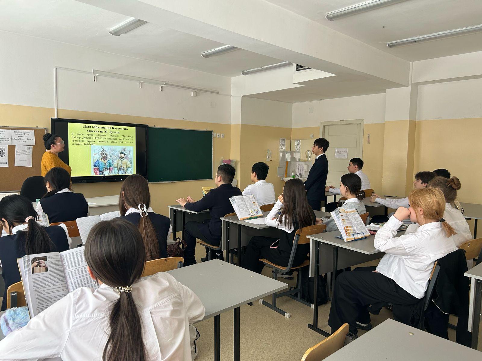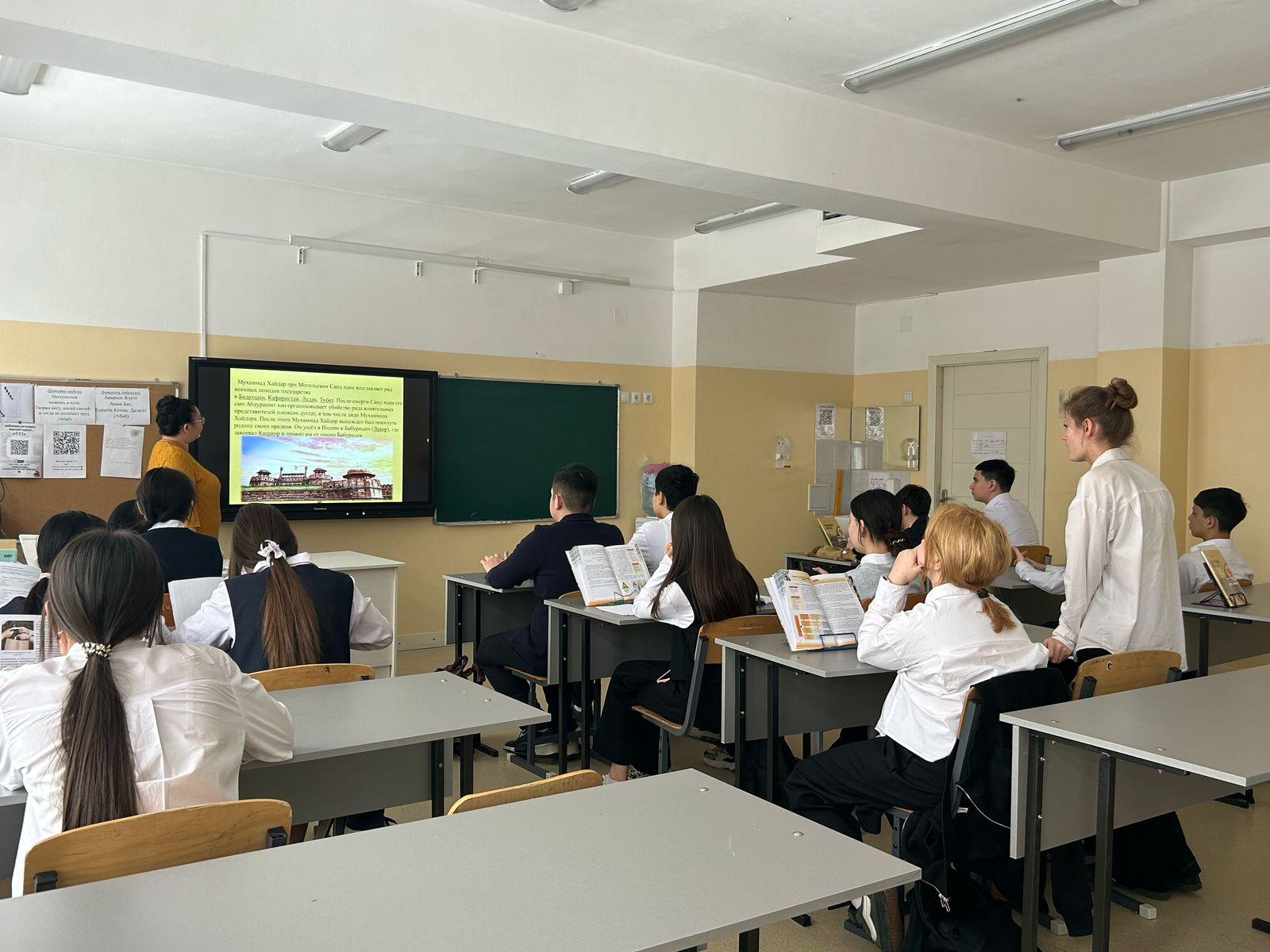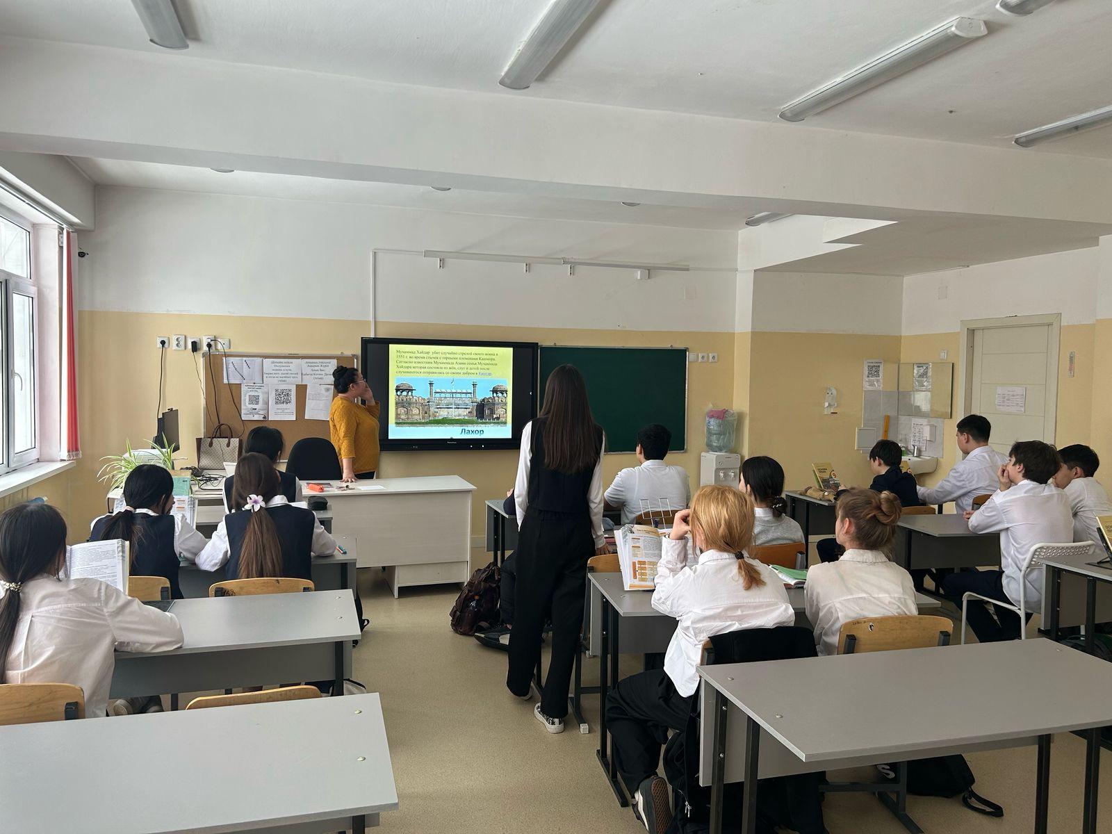 | Тарих пәнінің мұғалімі А. С. Сарапулова тарихшы-ғалым, жазушы, ақын, философ, әскери басшы Мұхаммед Хайдар Дулатидің (1499-1561)туғанына 525 жыл толуына арналған сабақ өткізді. Учитель истории Срапулова А.С., провела урок посвященный 525 лет со дня рождения ученого-историка, писателя, поэта, философа, военачальника Мухаммада Хайдара Дулати (1499-1561) |