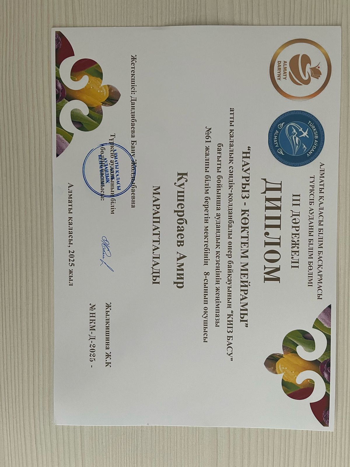 25 апрель 2025 0 1 2 3 4 5 "НАУРЫЗ - КОКТЕМ МЕЙРАМЫ" "НАУРЫЗ - КОКТЕМ МЕЙРАМЫ" атты калалык сэндік-колданбалы енер байкауны "КИІЗ БАСУ" багыты бойынша аудандык кезенінін женімпазыNº61 жалпы білім беретін мектебінін 8-сынып окушысы Кушербаев Амир Осы беттің QR-коды:QR-код этой страницы:
