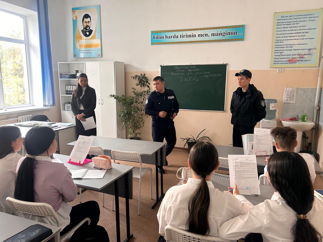 Түрксіб ауданының полиция лейтенанты Р.А.Рысалдиев "Құқықтық сауаттылықты арттыру: қылмыстық құқық бұзушылық жасағаны үшін кәмелетке толмағандардың жауапкершілігі. Әңгіме 5-11 сынып оқушылары үшін өткізілді.
