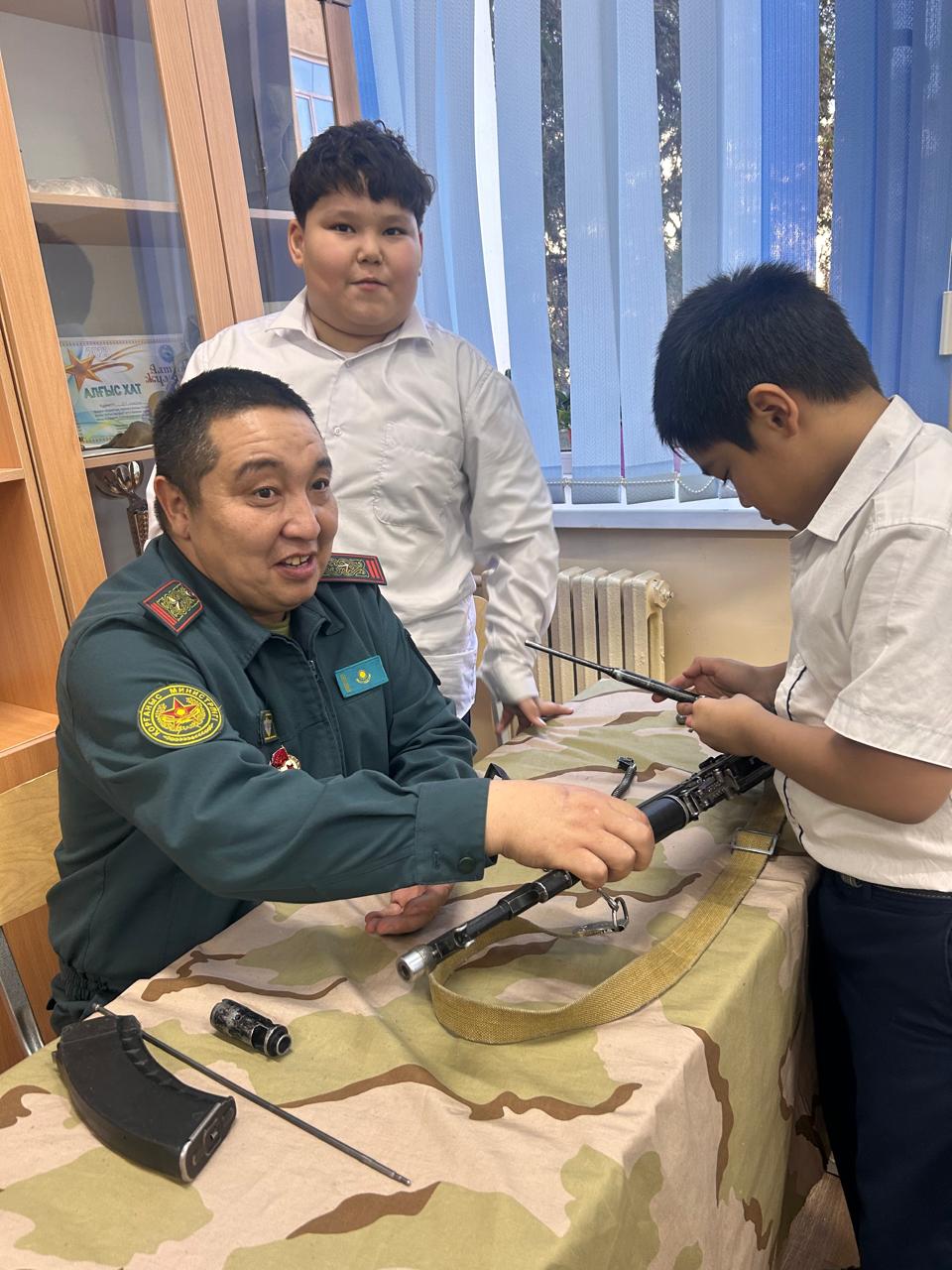 Работа военно-патриотического клуб «Қаһарман ұрпақ». Рукводитель Военно-патриотического клуб «Қаһарман ұрпақ» Усенов О.С., проводит занятия по сборке и разборке автомата.