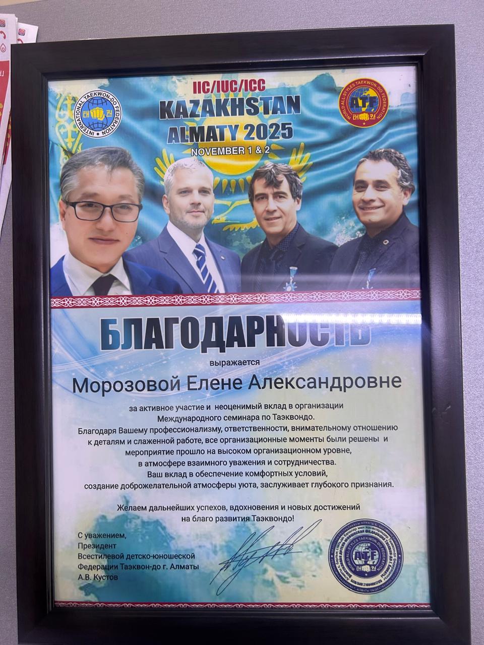 Алматы қаласында тэаквондо бойынша халықаралық семинар өткізуге қосқан үлесі үшін бастауыш сынып мұғалімі Морозова Елена Александровнаға АЛҒЫС айтылды. Алғыс тэаквондо Федерациясынан табысталды.