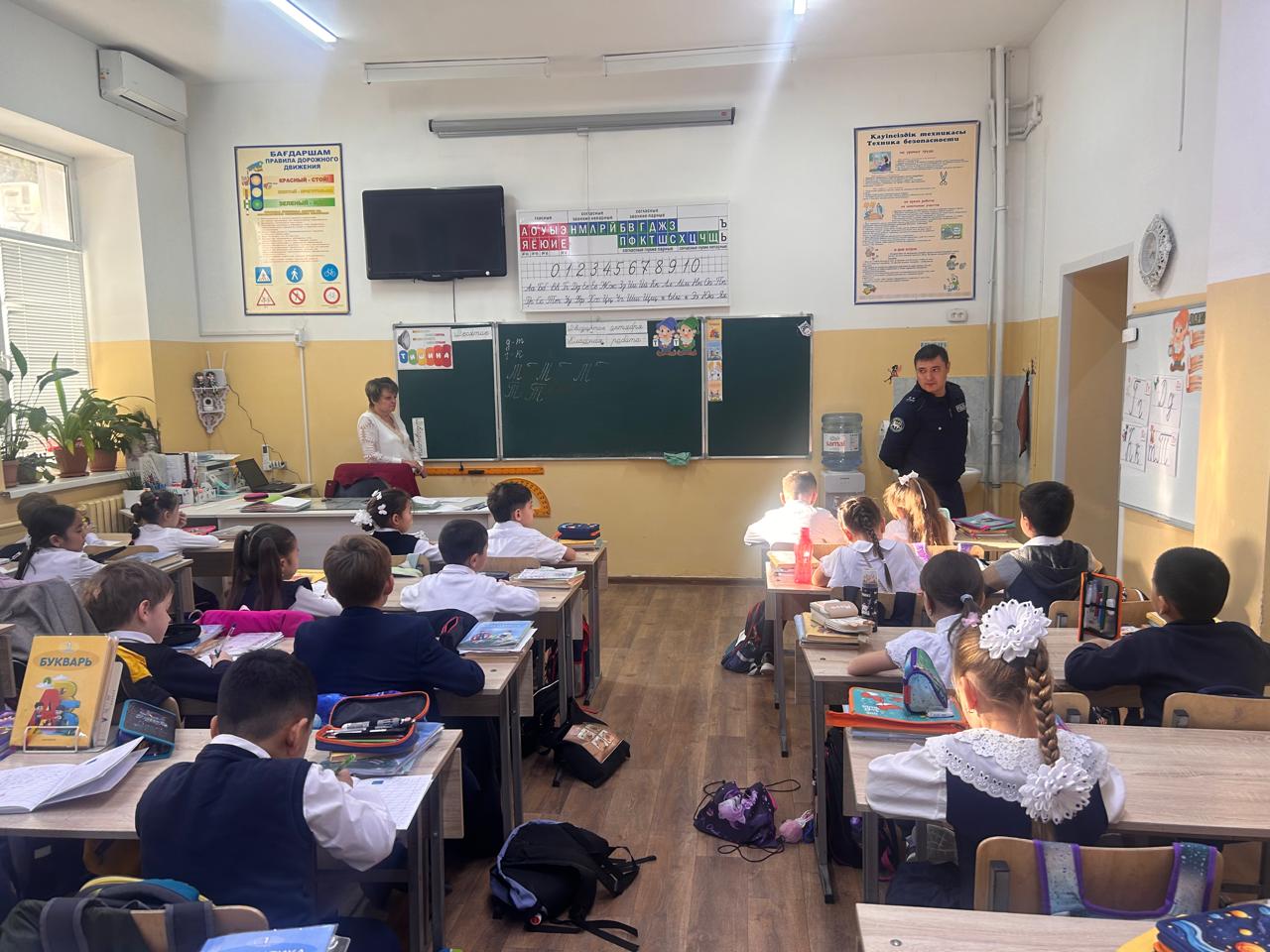 Бүгін мектеп инспекторы Рысалдиев Р. А. бастауыш сынып оқушылары үшін жол жарақатының алдын алу бойынша профилактикалық әңгіме өткізді. Сегодня школьный инспектор Рысалдиев Р.А., провел профилактическую беседу по профилактике дорожного травматизма для учащихся начальной школы.