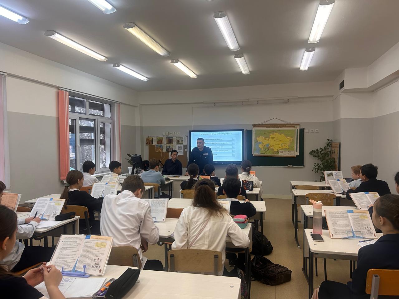 Сегодня старший лейтенант полиции УИП ОЮП ОМПС УП Турксибского района Рысалдиев Руслан Алексеевич провел профилактическую беседу на тему «Ответственность за совершение правонарушений и преступлений» среди 7-9 классов. В ходе встречи учащимся были разъяснены виды правонарушений и преступлений, а также ответственность, предусмотренная законодательством для несовершеннолетних. Особое внимание было уделено профилактике противоправного поведения и соблюдению норм закона. Учащиеся приняли активное участие в беседе, задавали вопросы и обсуждали предложенные ситуации.Вывод: Проведённая профилактическая работа способствовала повышению правовой грамотности учащихся и формированию ответственного отношения к своим поступкам.