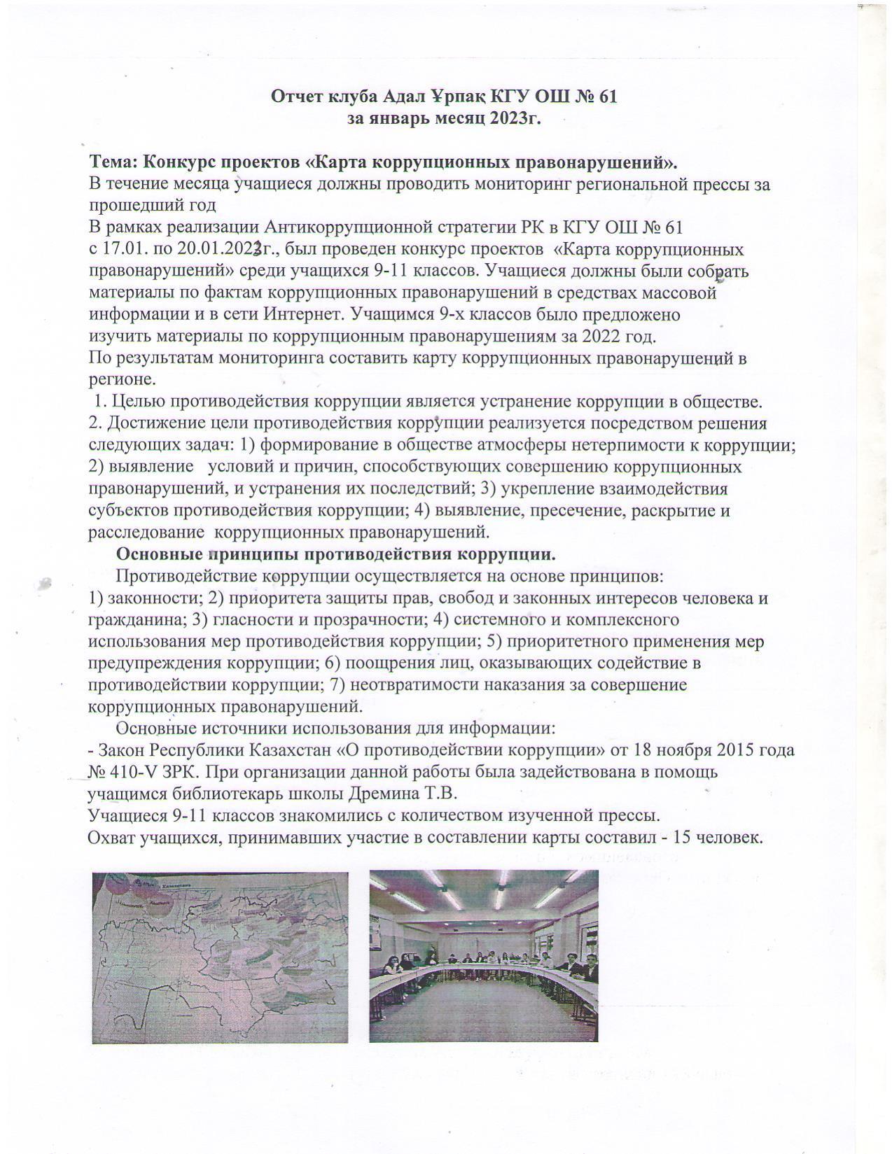 Жоспарға сәйкес 9-11 сынып оқушылары арасында "сыбайлас жемқорлық құқық бұзушылық картасы" жобалар конкурсы өткізілді. Согласно плану провели конкурс проектов "Карта коррупционных правонарушений" среди учащихся 9-11 классов.