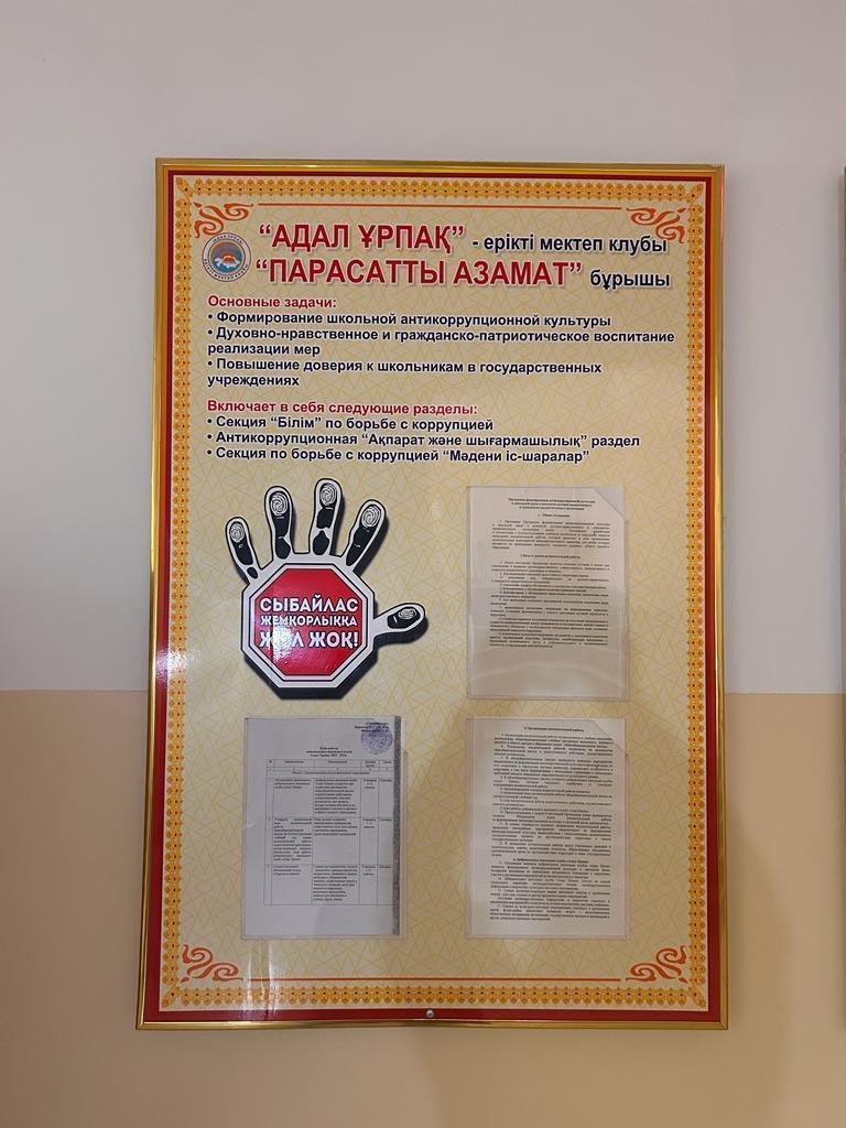 "Парасатты азамат" бұрышы. Бұрыштардың басты мақсаты-азаматтыққа, патриотизмге, адамның құқықтарын, бостандықтары мен міндеттерін құрметтеуге, моральдық сезімдер мен этикалық санаға, сыбайлас жемқорлықтан бас тарту мәдениетіне тәрбиелеу, еңбексүйгіштікке, оқуға, еңбекке, өмірге шығармашылық көзқарасқа тәрбиелеу.