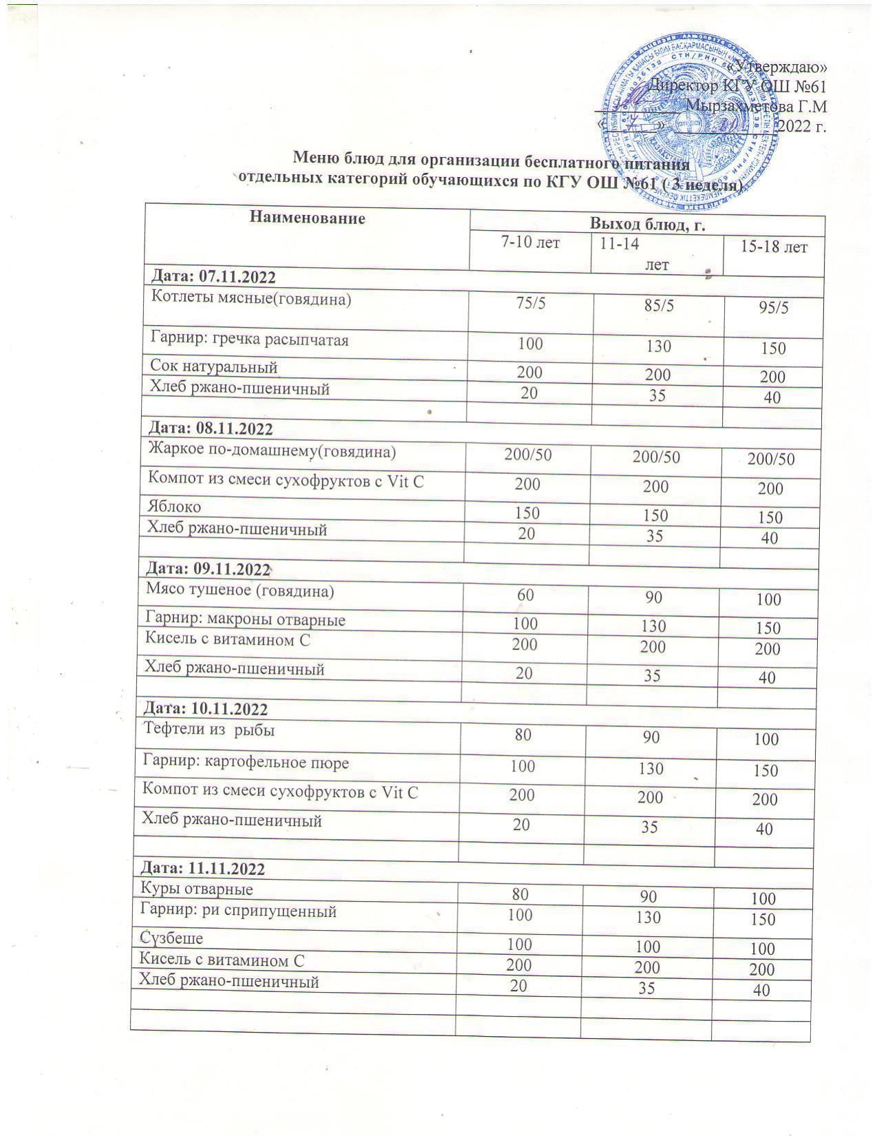 Меню 3 неделя, Мәзір 3 апта